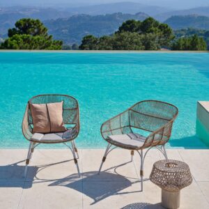 Sillón de ratán sintético para exterior con forma redondeada. Tiene un asiento y respaldo muy particular con terminaciones redondeadas. La base es de metal color...