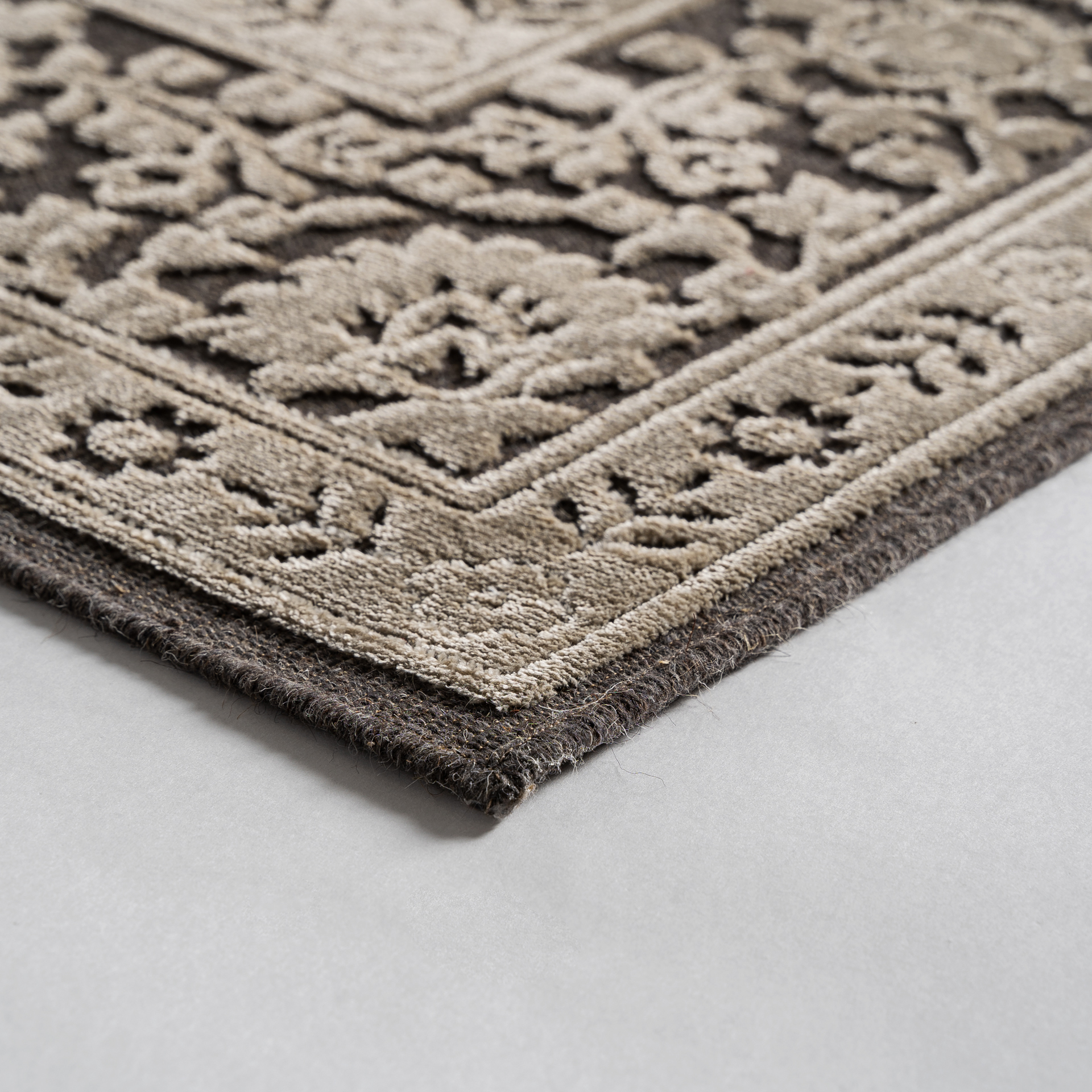 Alfombra lisa de estilo clásico fabricado en viscosa en color beige en color gris.