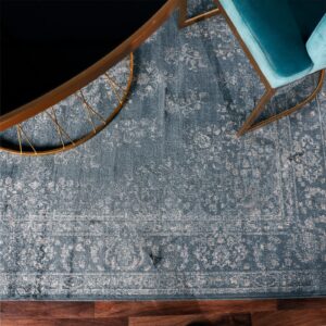 Alfombra rectangular de tonos azules hecha de viscosa y algodón para conseguir un aspecto suave y cálido para cualquier ambiente del hogar. La peculiaridad no solo reside en su diseño único sino en su producción: tejida a máquina con pelo corto con una densidad de 750.000/m2 . Se puede lavar a mano fácilmente o con aspiradora y cepillar para conseguir un aspecto esponjoso y suave. Además es apta para suelo radiante. 160×230 cm.