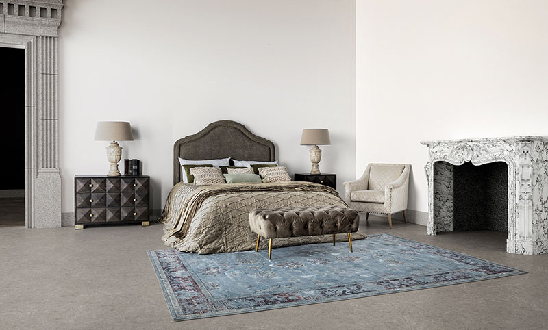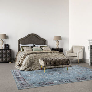 Alfombra rectangular mirta de estilo clásico fabricado en viscosa en color turquesa. Backing: 43% algodón 33% poliéster 20% latex 4% viscosa.