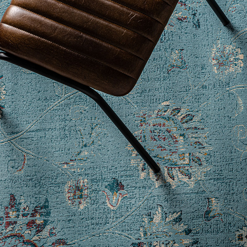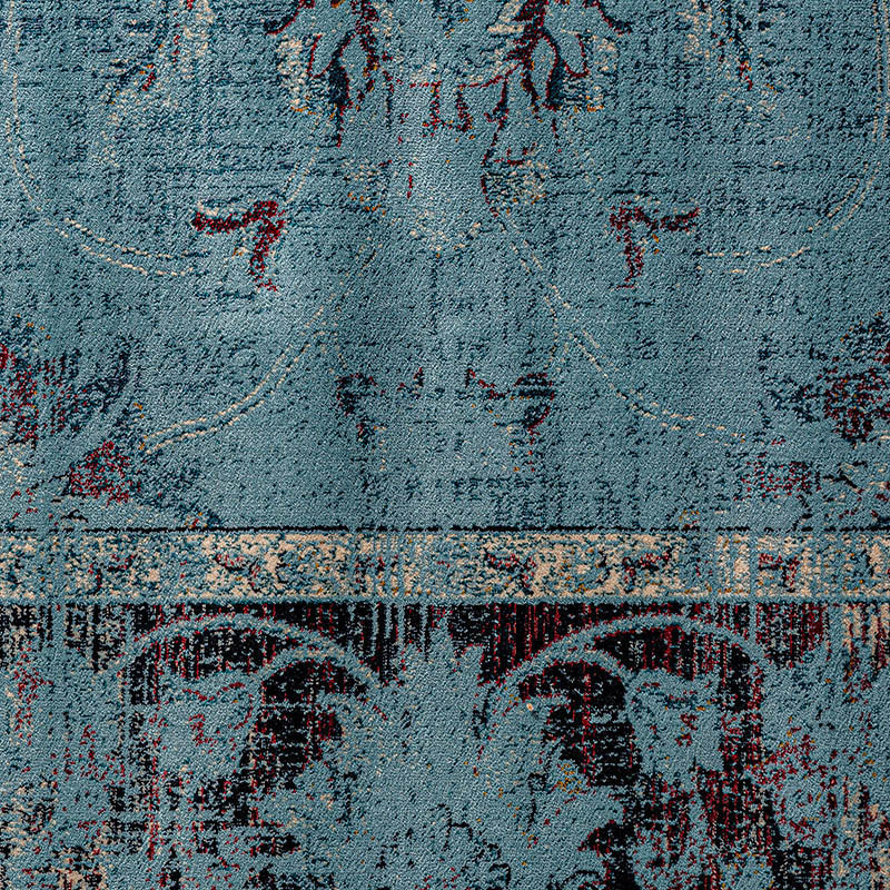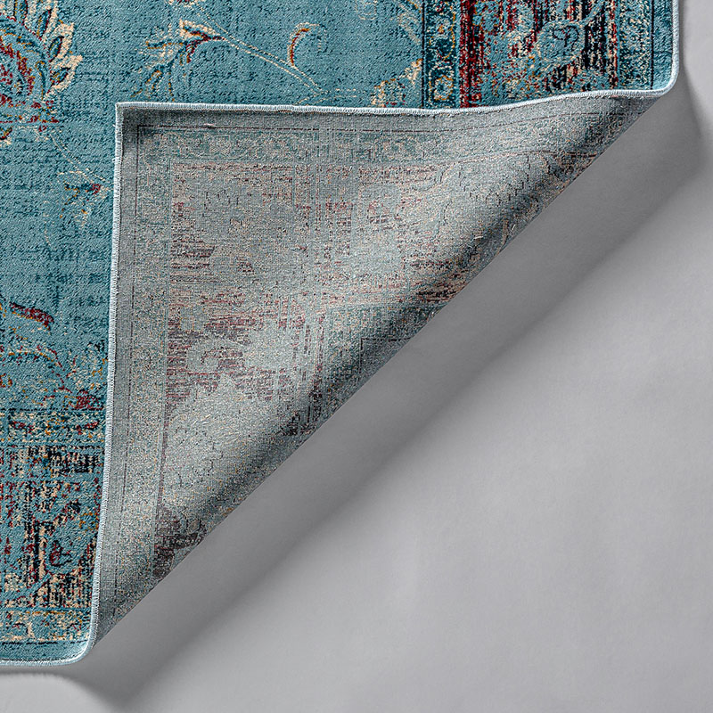 Alfombra rectangular suyay, en color turquesa ribeteado, de estilo shabby chic. Fabricado en viscosa. Backing: 43% algodón, 33% poliéster, 20% latex, 4% viscosa.