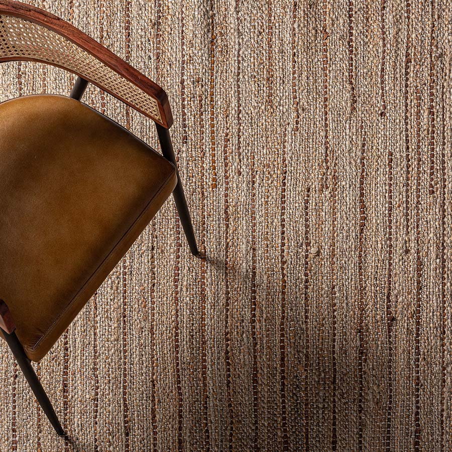 Alfombra thimba de estilo boho fabricado en yute en color tonos en marrón combinado con piel.