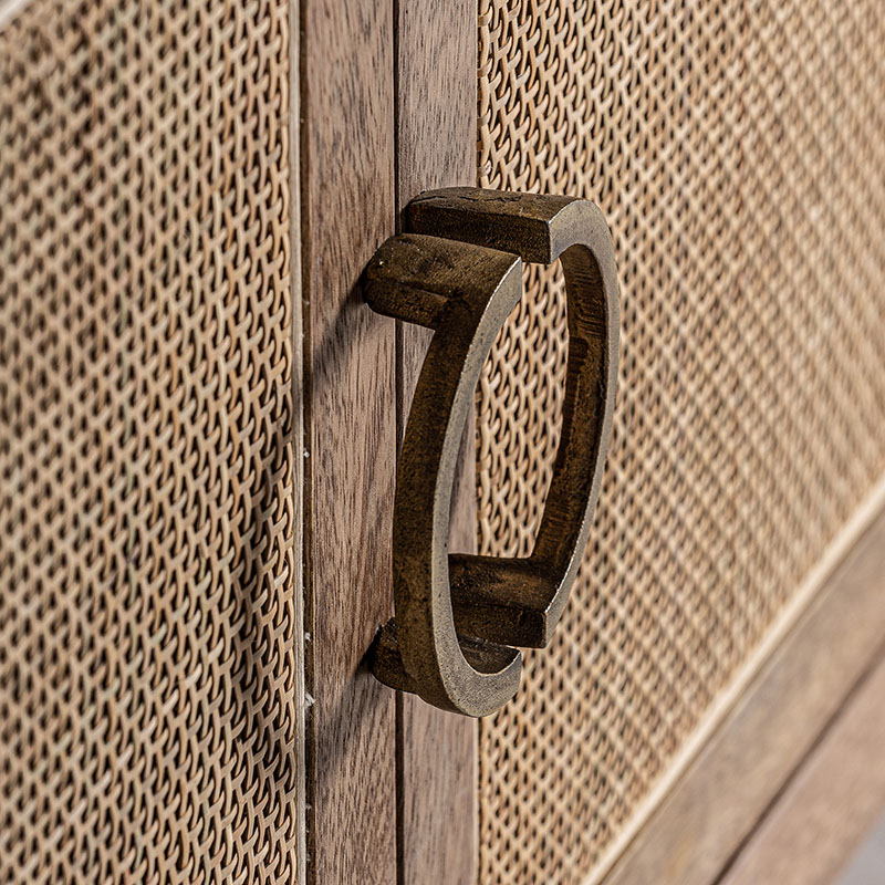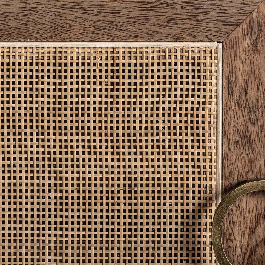 Aparador beckley de estilo nórdico, fabricado en madera de mango en color marrón y mimbre en color marrón claro.