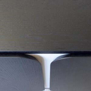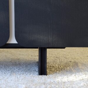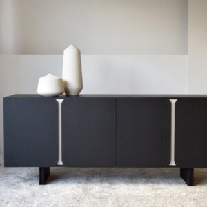 APARADOR COLECCIÓN CURVA. APARADOR REALIZADO EN DM RECHAPADO EN ROBLE NATURAL TEÑIDO EN COLOR NEGRO DE ACABADO MATE. DETALLES LACADOS EN TONO GRIS ARENA MATE. CUENTA CON 4 PUERTAS Y ESTANTES INTERIORES.