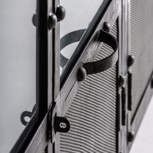 Aparador jeding de estilo art deco fabricado en hierro en color negro combinado con madera de mango en color oro y espejo.
