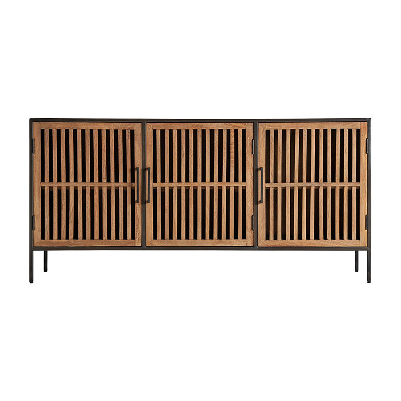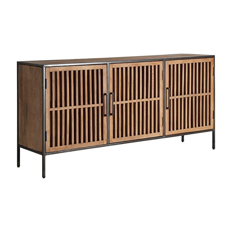 Aparador Gaffney de estilo industrial fabricado en madera de mango en color marrón combinado con hierro en color negro.