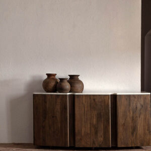 Aparador konz de estilo contemporáneo fabricado en madera de mango en color blanco combinado con mármol en color marrón. Producto desmontable.