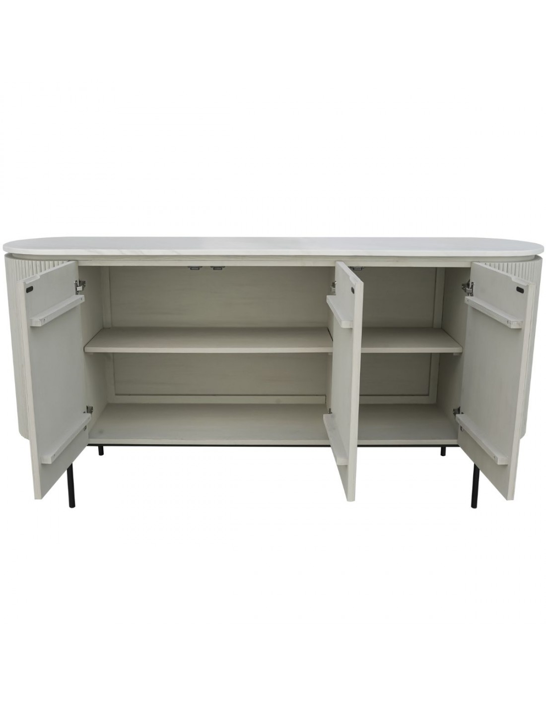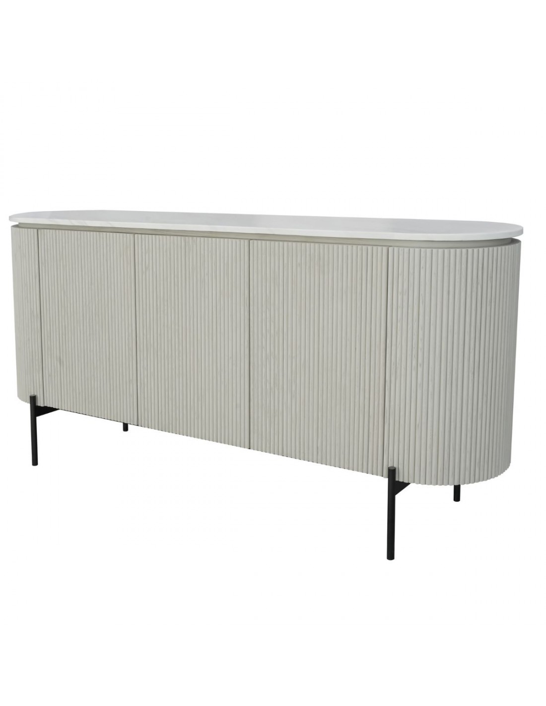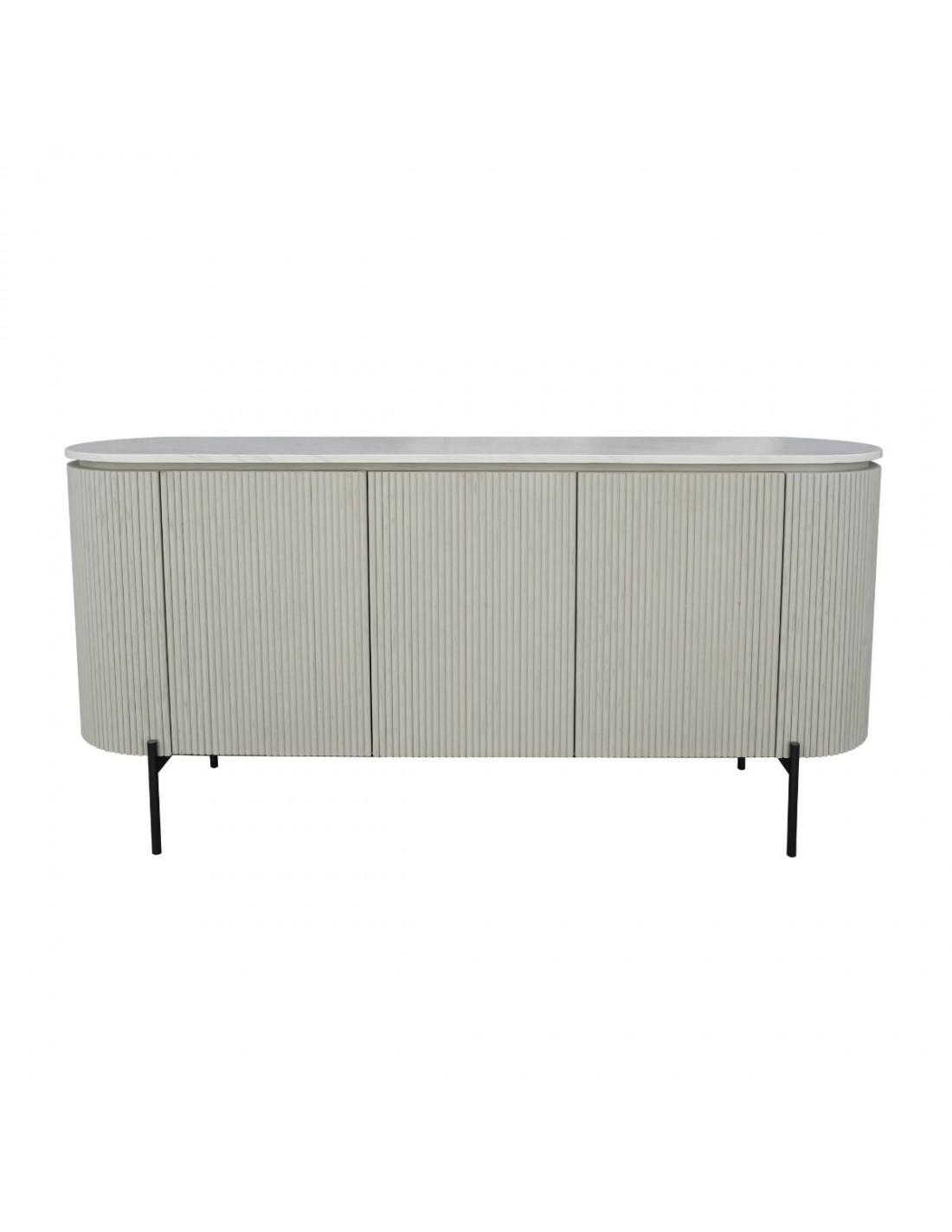 Aparador acabado en madera de roble color blanco grisáceo. Sobre de piedra en tonos blancos y pata de metal en color negro. Es una pieza con toque retro de lénas curvas en combinación con rectas en el diseño de sus puertas y cuerpo que cuenta con efecto listones de madera. Es una pieza con mucha personalidad, de estilo sofisticado y mucha capacidad para salones con mucho estilo. *NOTA: El color puede variar en función de la luz recibida. La tonalidad es un blanco grisáceo. En estancias con más luz natural se apreciará un tono más claro y en zonas con menos luz natural la tonalidad irá a más gris