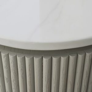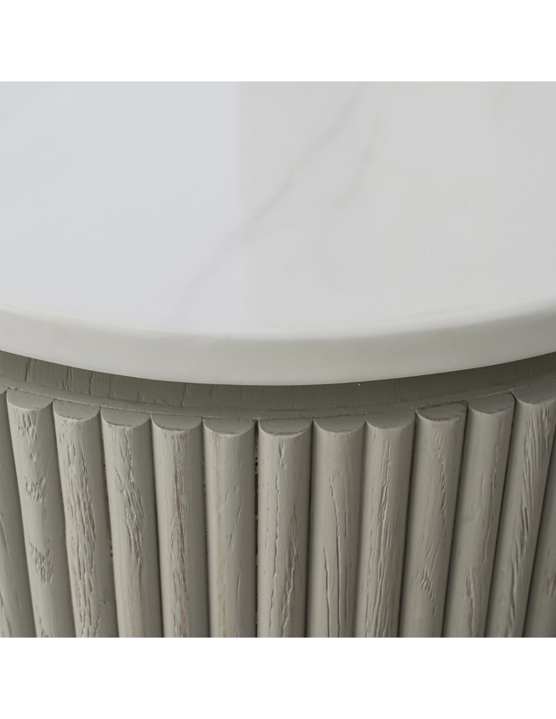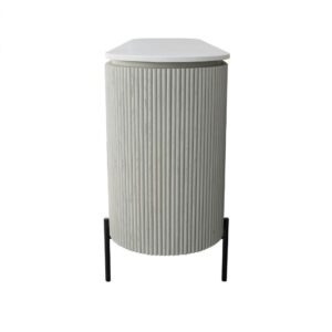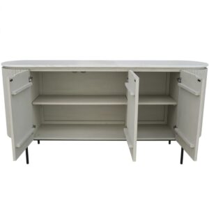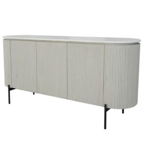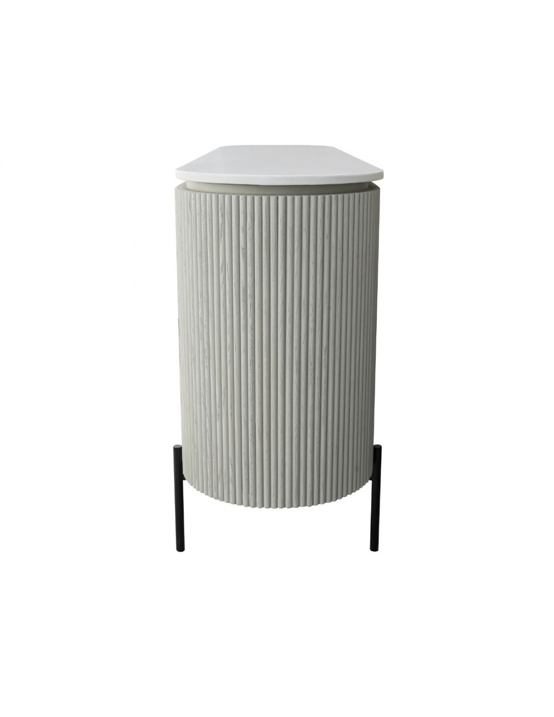 Aparador acabado en madera de roble color blanco grisáceo. Sobre de piedra en tonos blancos y pata de metal en color negro. Es una pieza con toque retro de lénas curvas en combinación con rectas en el diseño de sus puertas y cuerpo que cuenta con efecto listones de madera. Es una pieza con mucha personalidad, de estilo sofisticado y mucha capacidad para salones con mucho estilo. *NOTA: El color puede variar en función de la luz recibida. La tonalidad es un blanco grisáceo. En estancias con más luz natural se apreciará un tono más claro y en zonas con menos luz natural la tonalidad irá a más gris