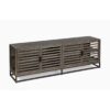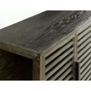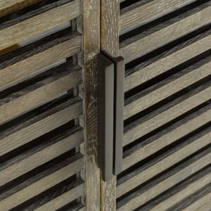 Un modelo en madera de roble grisáceo. Tiene estructura de metal y tiradores de línea sencilla también en metal. Sus laterales y las cuatro puertas frontales están acristaladas. El interior de gran capacidad está delimitado por una balda, que divide el interior en dos secciones. ¡Un mueble útil y chic que debe presidir el salón de cualquier casa!