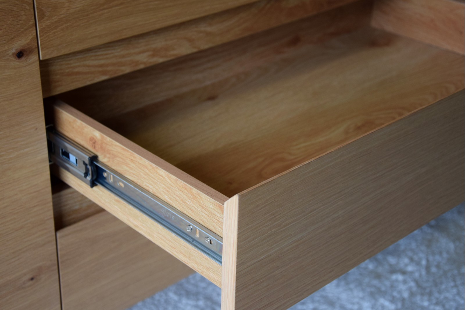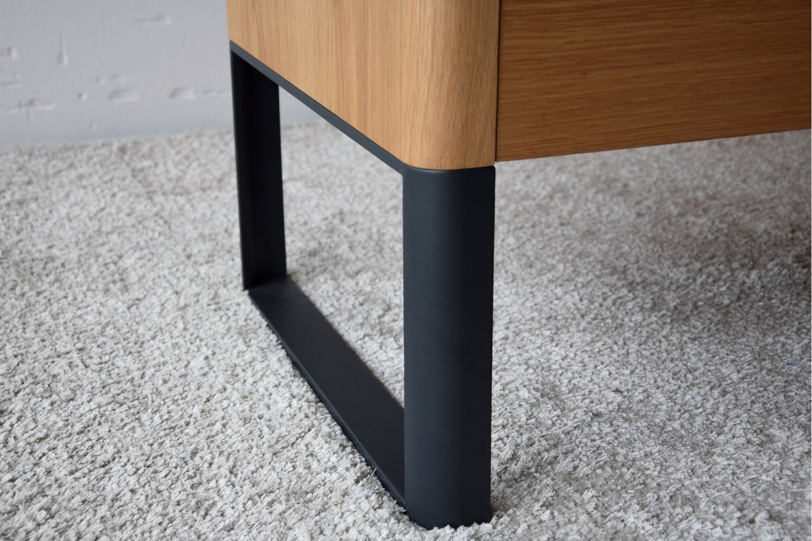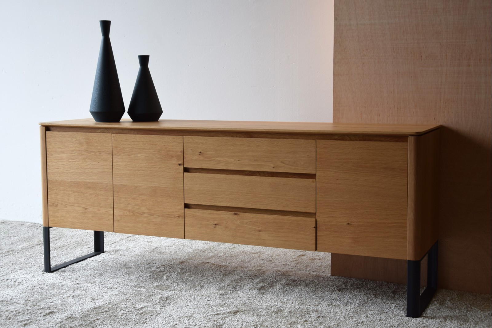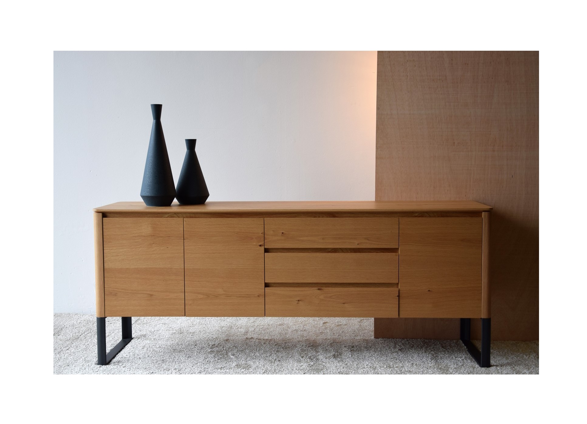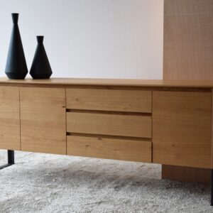 APARADOR REALIZADO EN DM RECHAPADO EN MADERA DE ROBLE NATURAL MATE CON PATAS EN ACERO EN GRAFITO MATE. CUENTA CON TRES CAJONES Y TRES PUERTASINCLUYE BALDAS INTERIORES EN EL MISMO ACABADO.