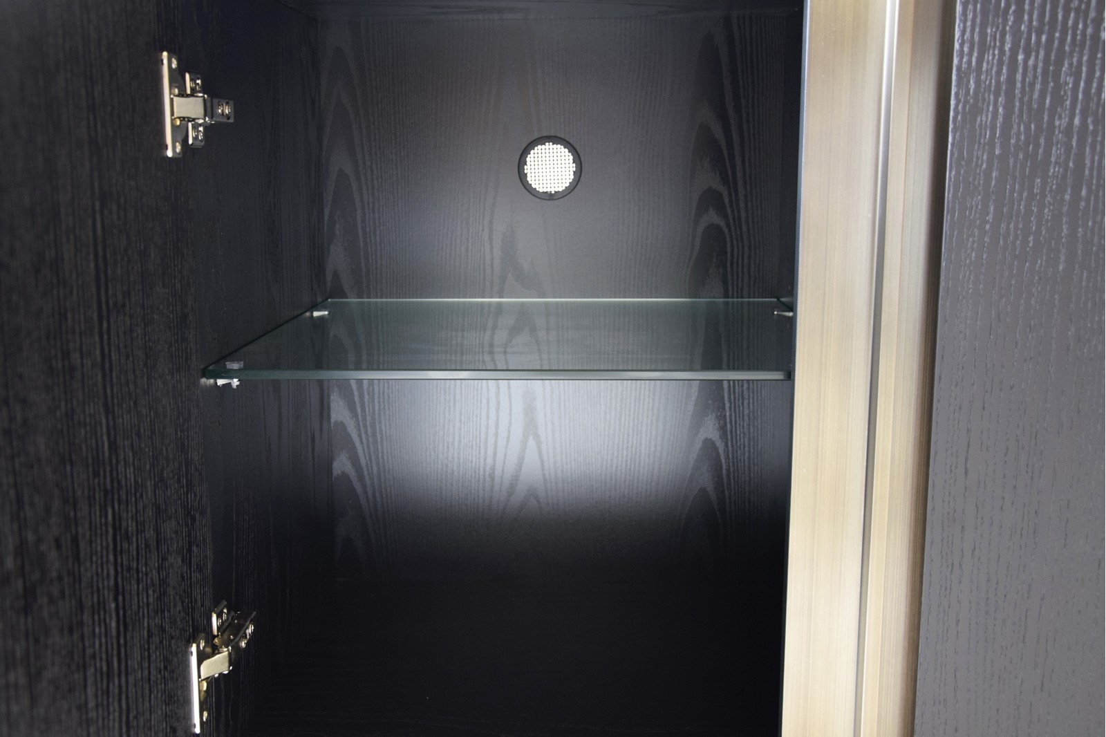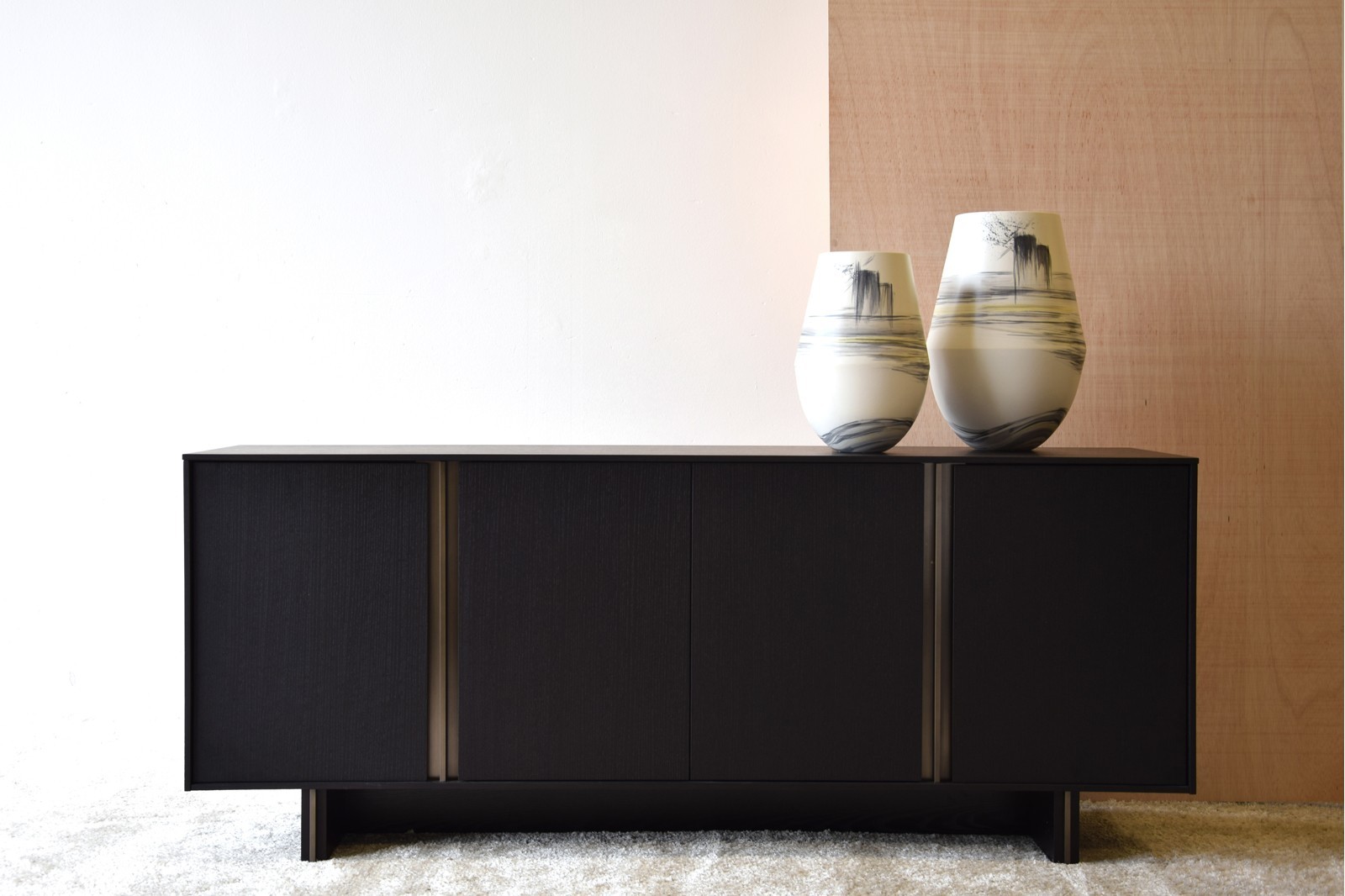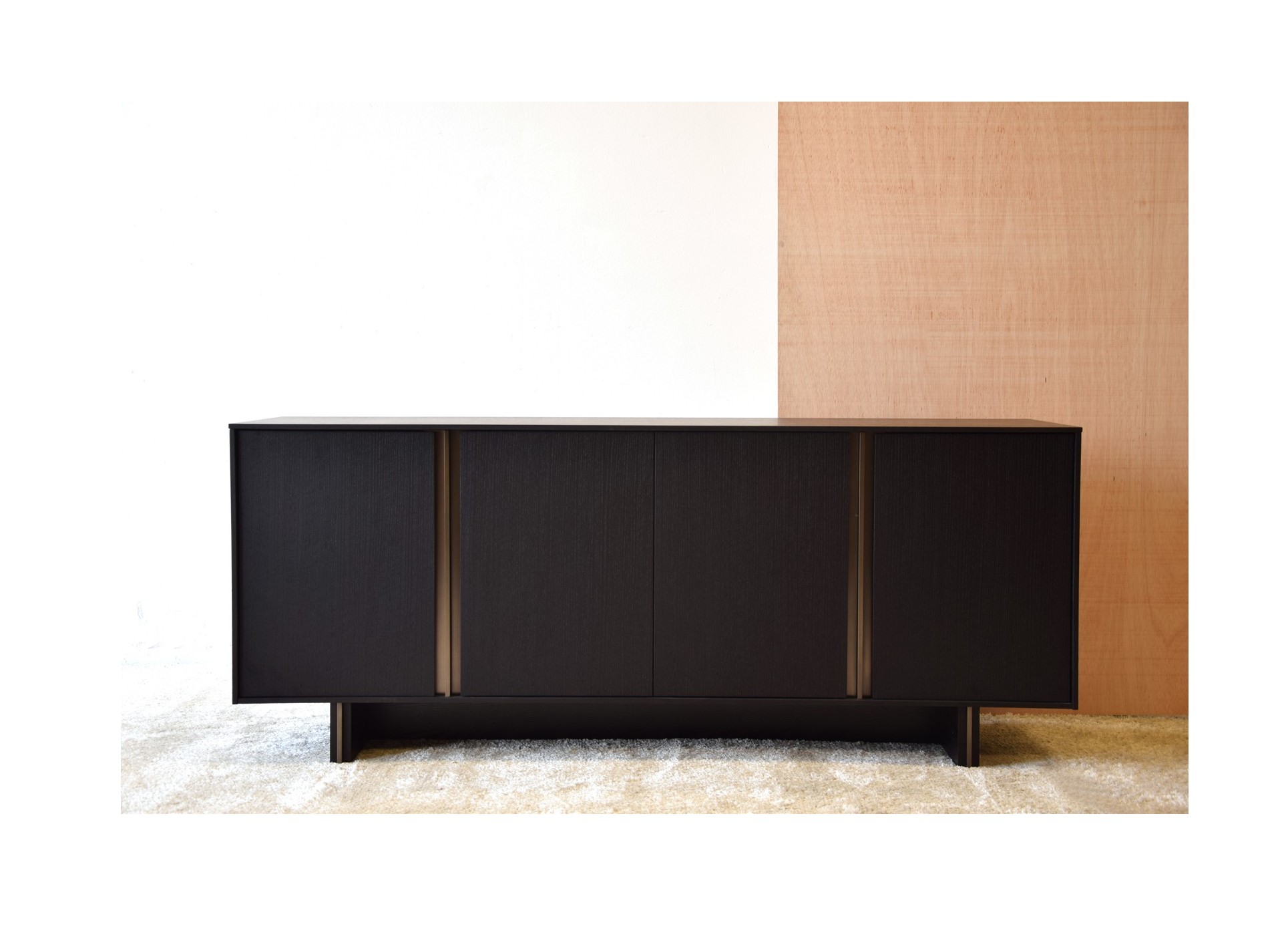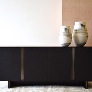 APARADOR REALIZADO EN DM RECHAPADO EN MADERA DE ROBLE TEÑIDO EN NEGRO MATE. DETALLES EN ACERO CON ACABADO LATÓN CEPILLADO EN TIRADORES Y PATAS. CUATRO PUERTAS.INCLUYE BALDAS INTERIORES DE VIDRIO TEMPLADO.