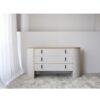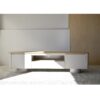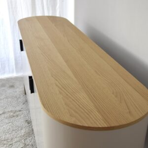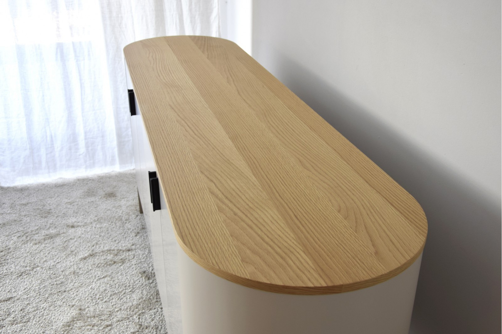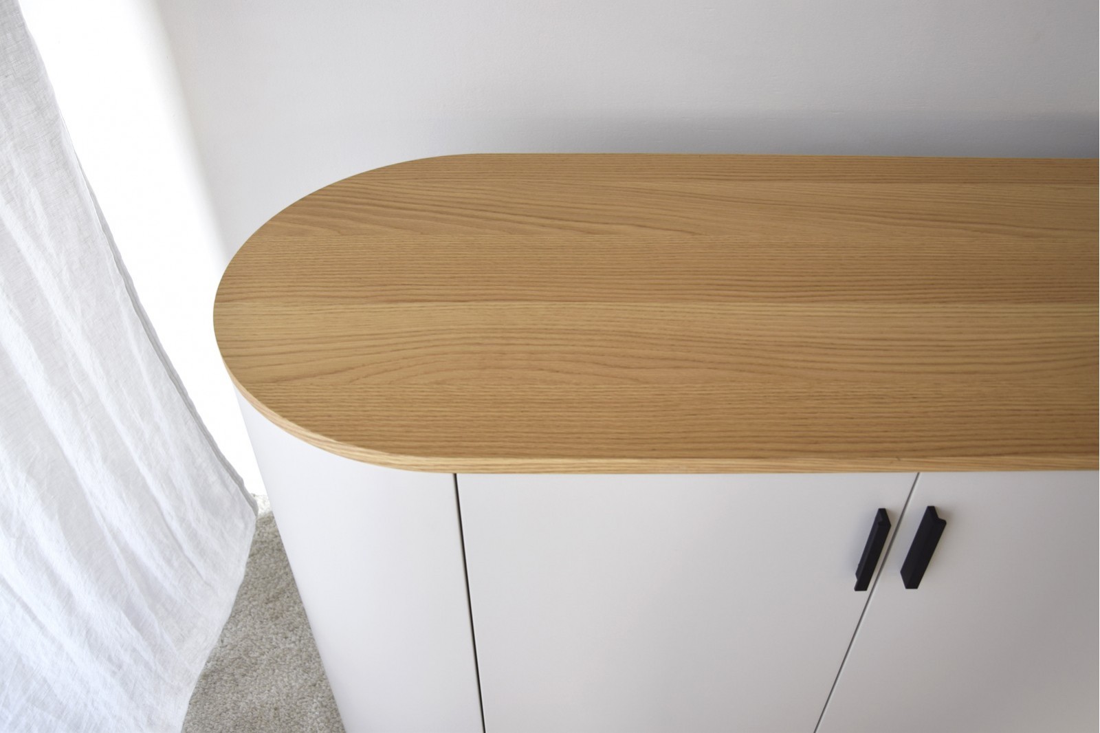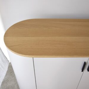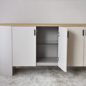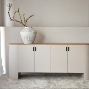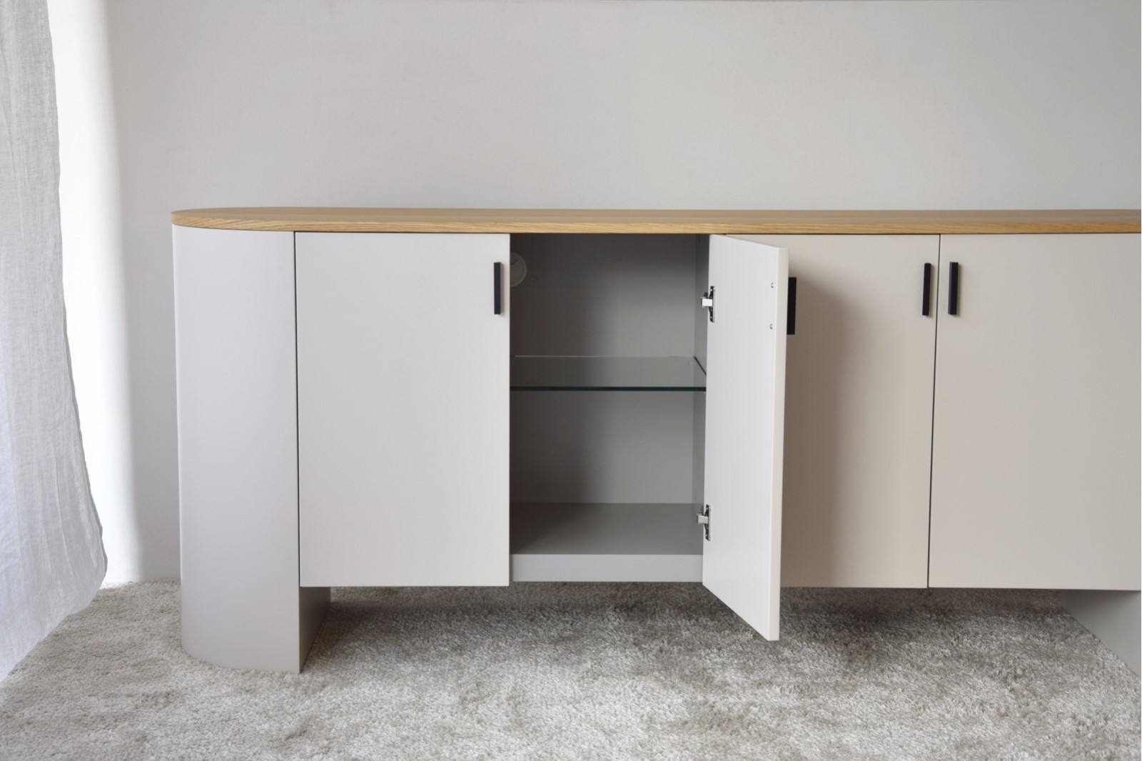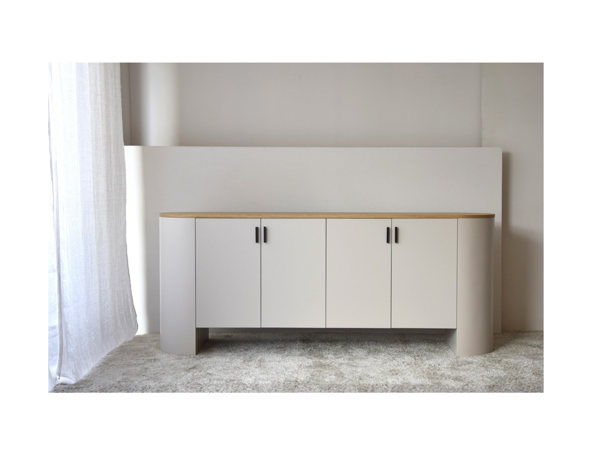 APARADOR REALIZADO EN DM LACADO EN TONO GRIS ARENA CON ACABADO MATE Y PARTE SUPERIOR RECHAPADA EN MADERA DE ROBLE NATURAL. PIEZA DE MOBILIARIO DE LINEAS SUAVES Y SINUOSAS CON BORDES REDONDEADOS Y DISEÑO ATEMPORAL CAPAZ DE APORTAR UN ORDEN PERFECTO A CUALQUIER ESPACIO DE TU VIVIENDA. LA COMBINACION DEL LACADO MATE CON LA MADERA DE ROBLE DA COMO RESULTADO UNA PIEZA DE MOBILIARIO CÁLIDO Y CONTEMPORÁNEO. EL CUERPO PRINCIPAL ESTÁ FORMADO POR 4 PUERTAS CON APERTURA SUAVE Y SENCILLA.