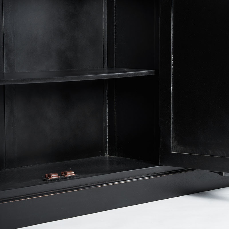 Aparador zenica de estilo colonial fabricado en madera de mango en color negro combinado con vidrio y madera dm. Compatible con: 33010.