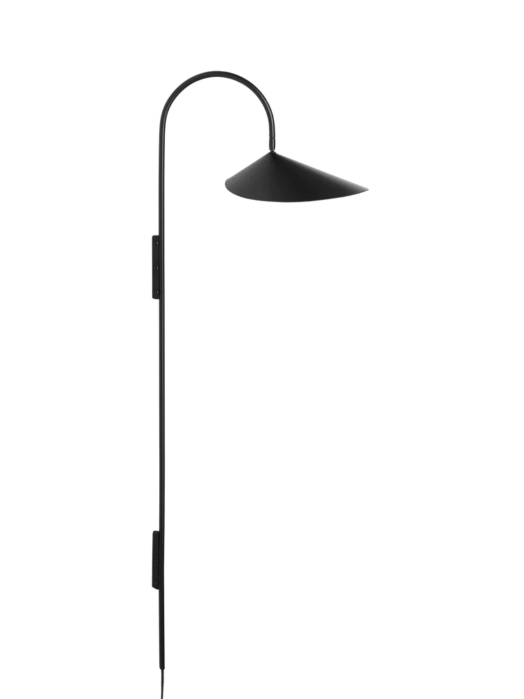 Una versión más alta de nuestra lámpara de pared Arum, esta iteración tiene una silueta esbelta, creada a partir de metal tubular con recubrimiento de polvo negro que oculta un cordón textil. Híbrido entre lámpara de pie y aplique, el elegante diseño en negro aporta personalidad a un espacio, iluminándolo con luz ambiental.