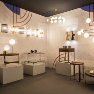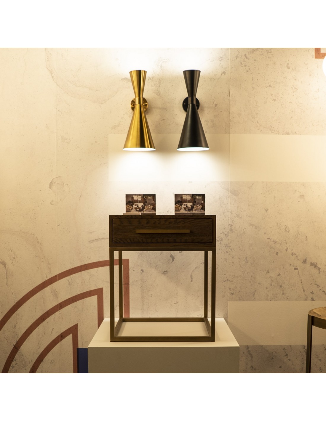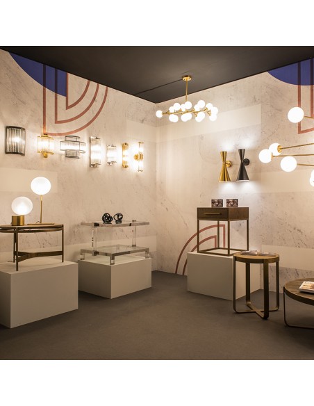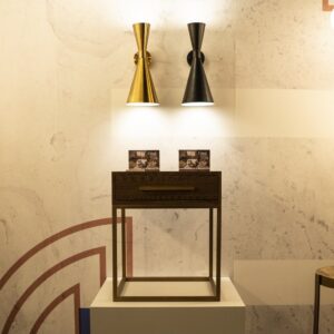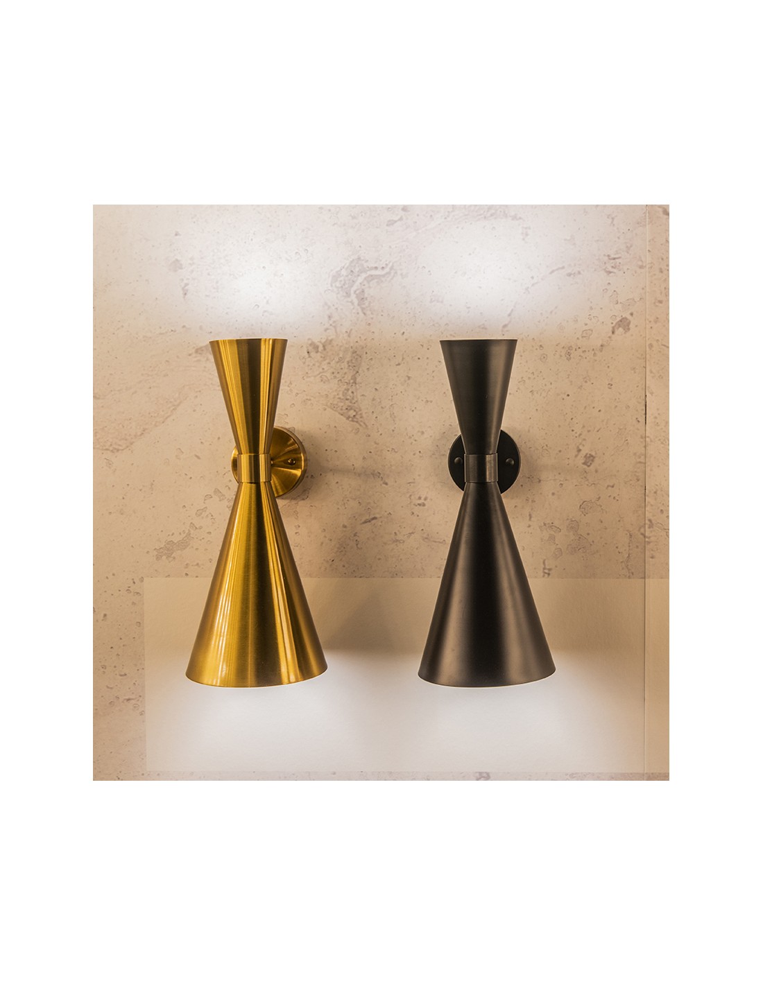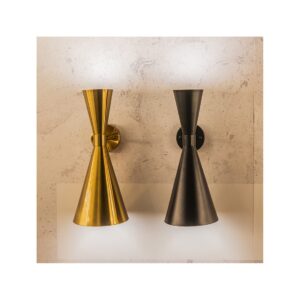 Lámpara aplique de pared dorado envejecido con estructura metálica y líneas geométricas.