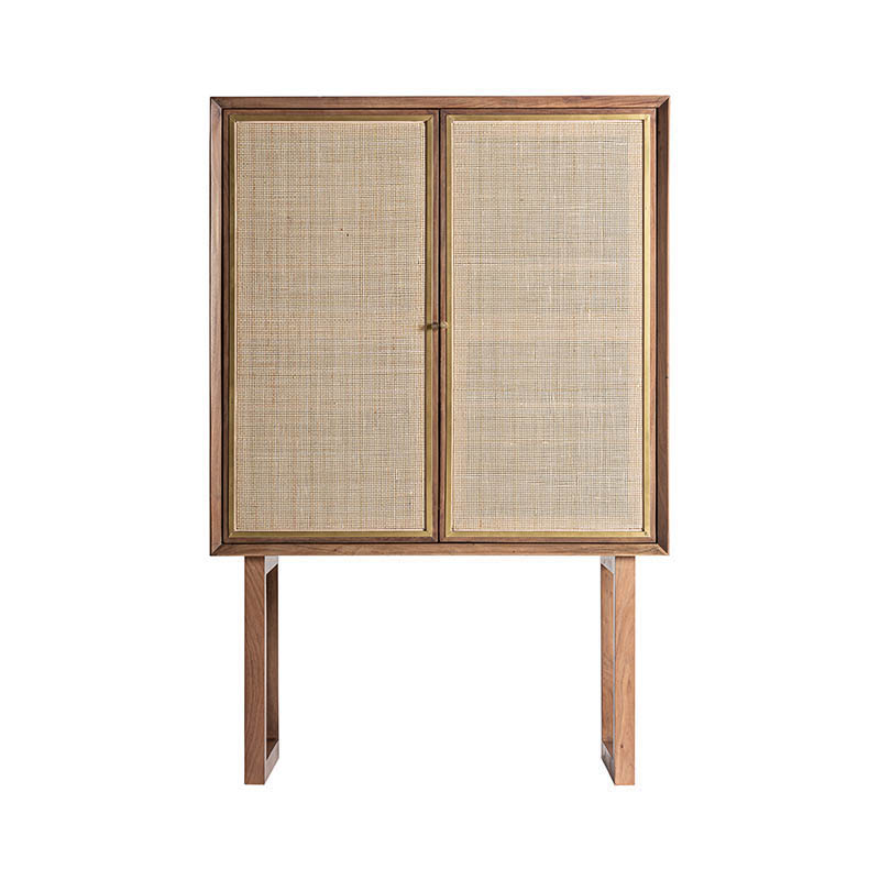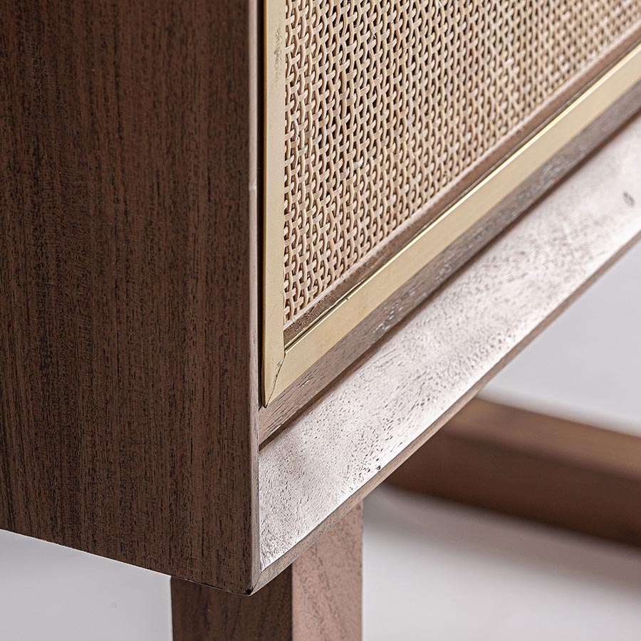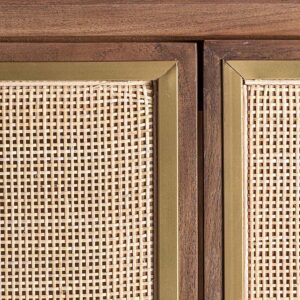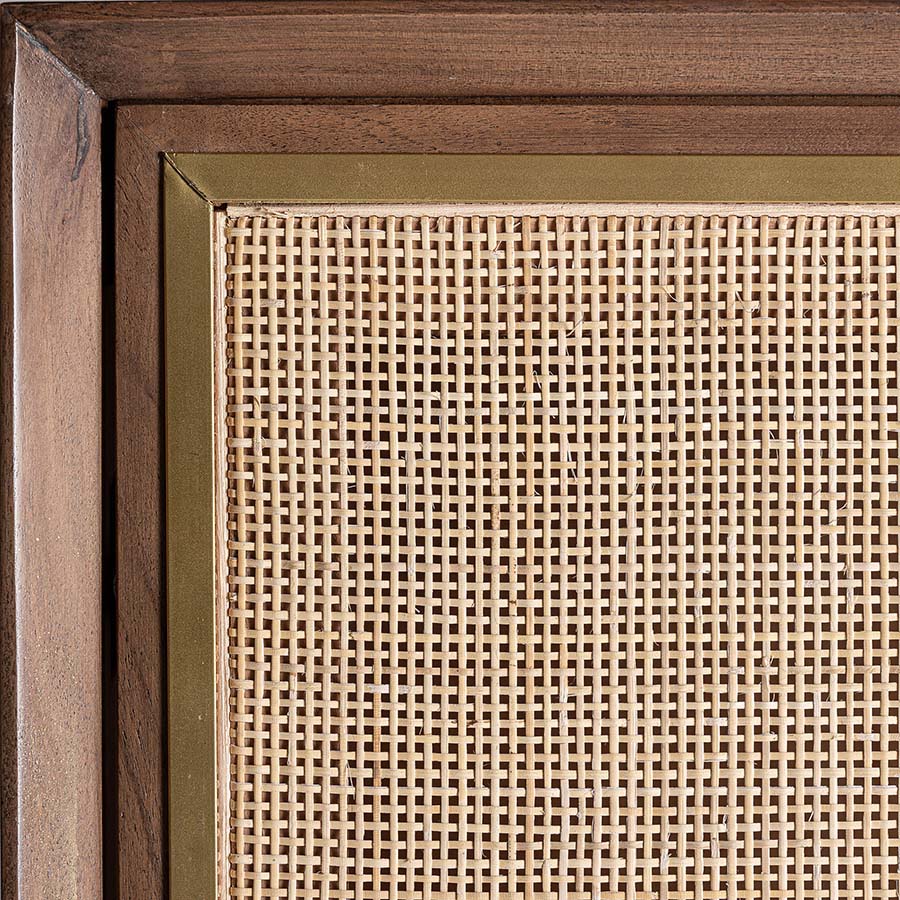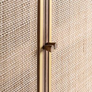 Armario Gondorf de estilo nórdico fabricado en madera de mango en color marrón combinado con latón en color oro y ratán en color marrón claro. Producto desmontable.