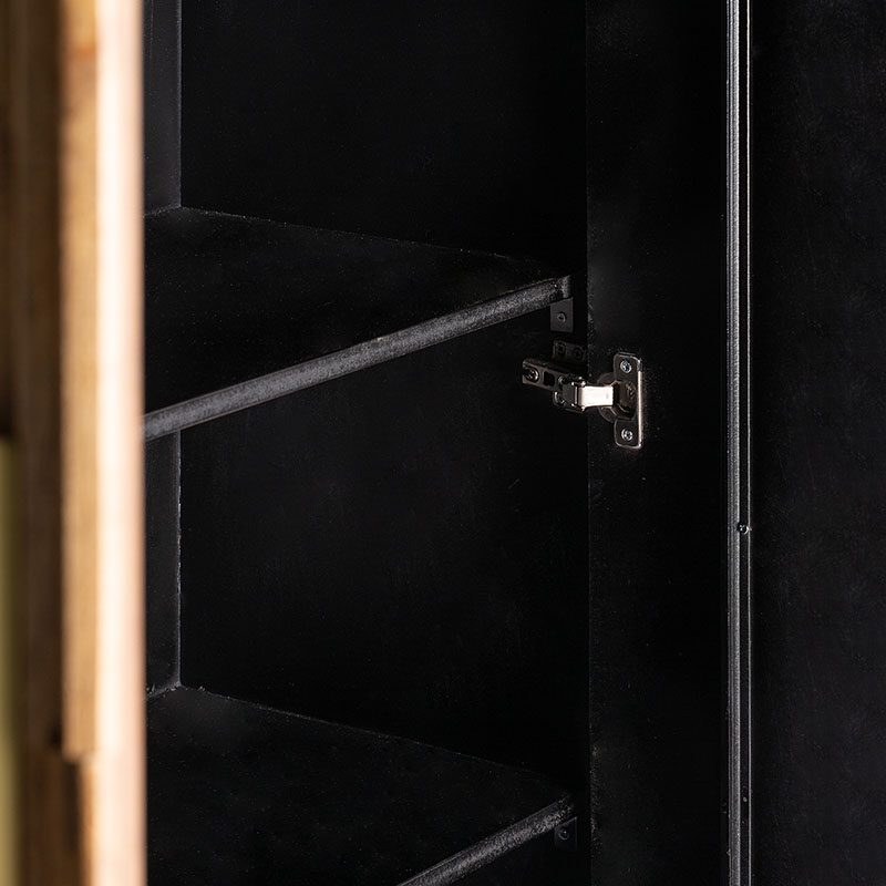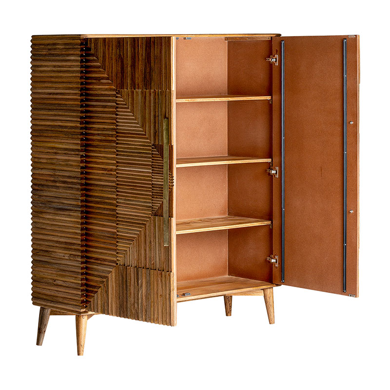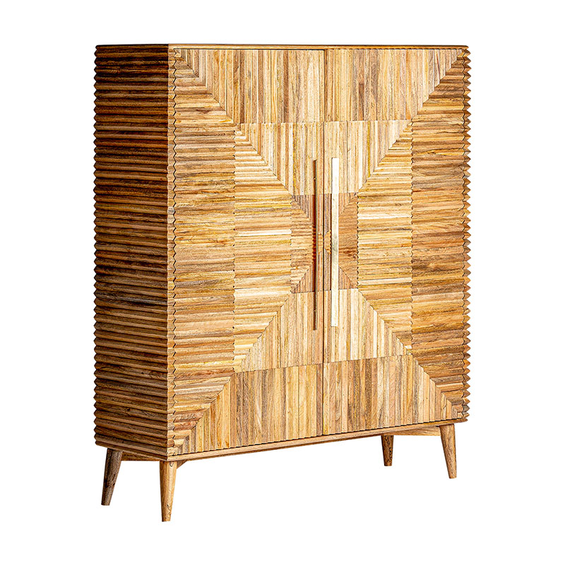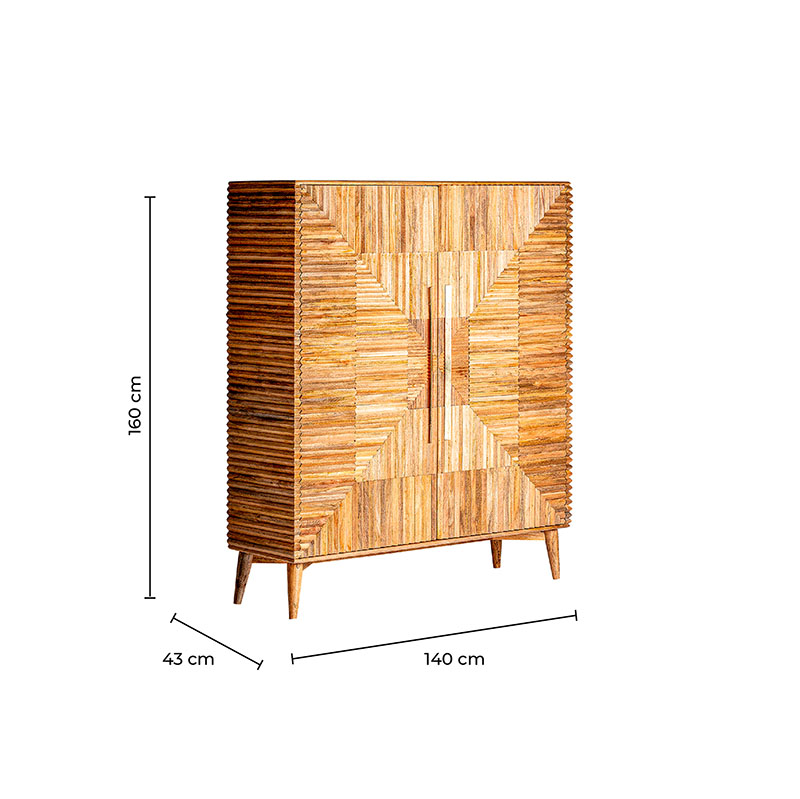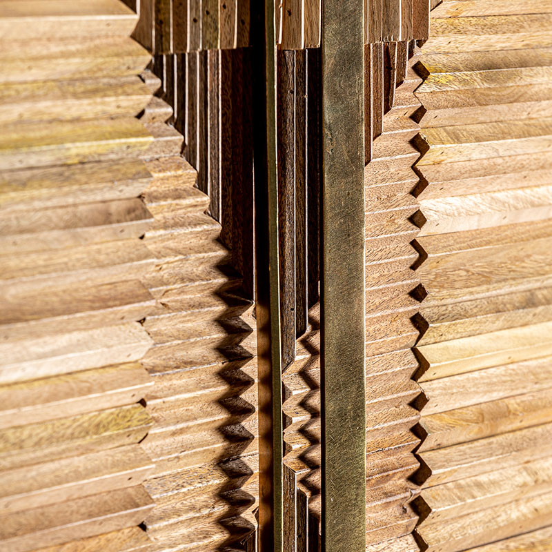Armario plissé wood, en color marrón, de estilo art deco. Fabricado en madera de mango, combinado con hierro. Patas de hierro con acabado imitando a madera. Producto desmontable.