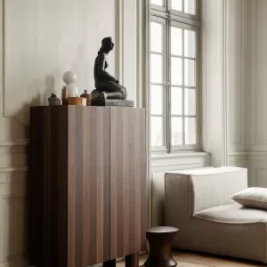 Inspirado en el brutalismo, el gabinete Post Storage juega con los volúmenes para presentar una extraordinaria solución de almacenamiento con detalles elaborados que lo atraen. Hecho de madera con certificación FSC™ Mix, el gabinete presenta detalles de madera rayada en chapa de roble que se logró a través de un intrincado y una técnica de carpintería que requiere mucho tiempo y que se conoce como marquetería. Preservando la expresión simple e ingeniosa del frente a rayas, las puertas del gabinete se abren y cierran con un mecanismo oculto para evitar manijas visibles.