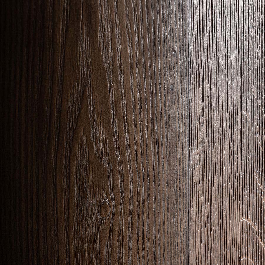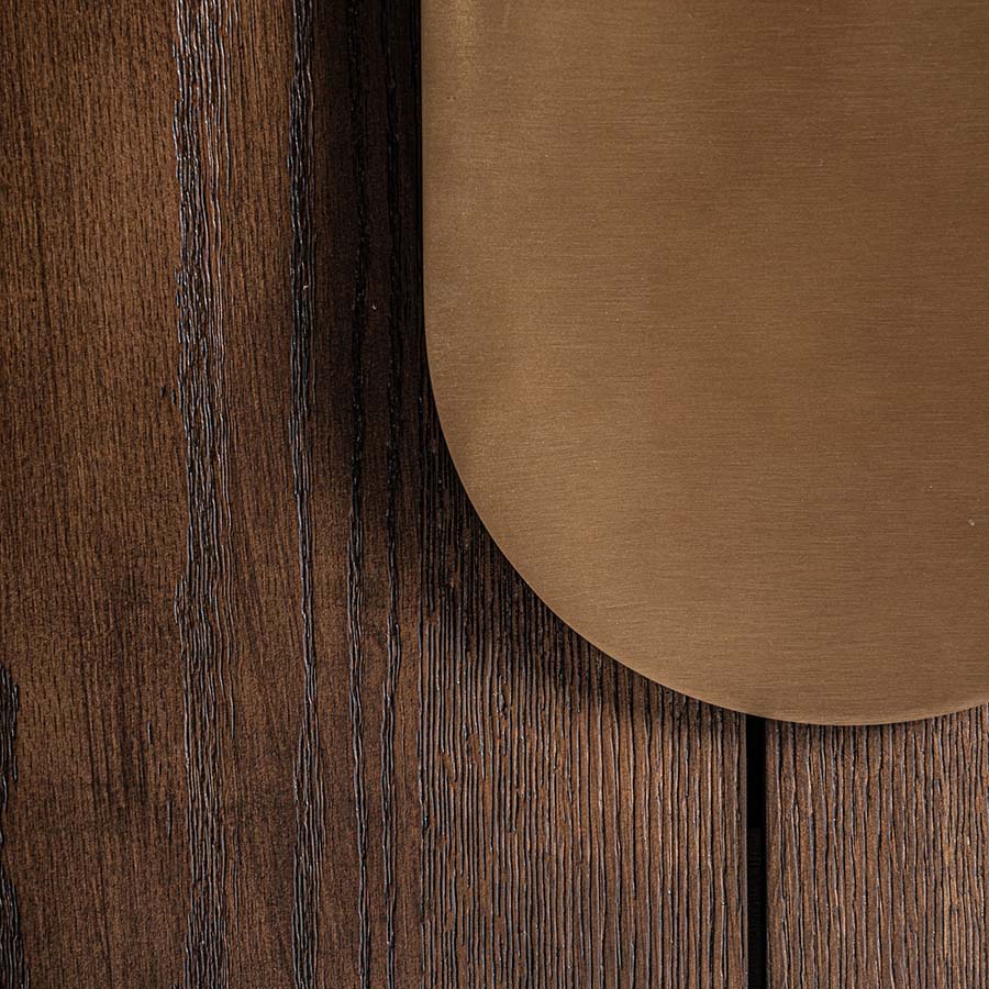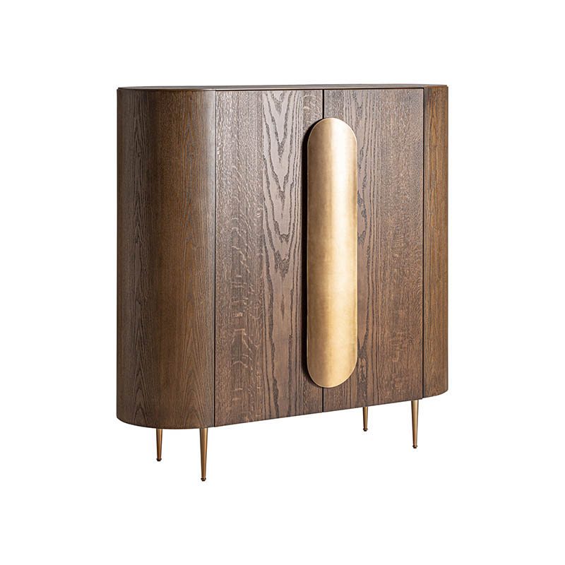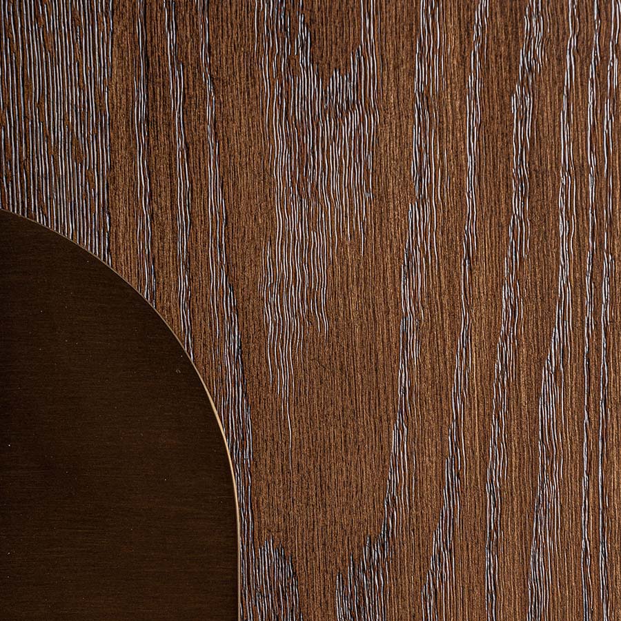 Armario Treignac de estilo art deco fabricado en chapa de roble en color marrón con acabado teñido combinado con madera dm y acero inoxidable en color oro con acabado mate. Producto desmontable.