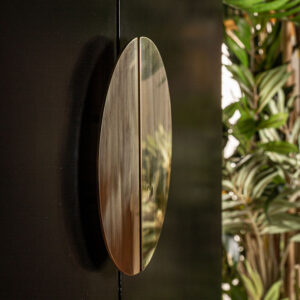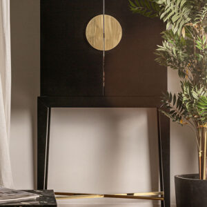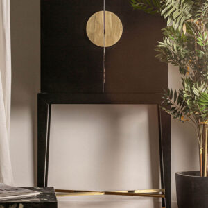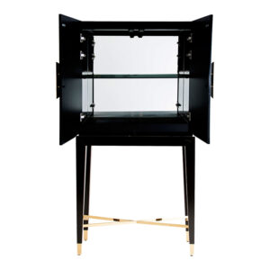 Armario vinh en color negro oro pintado de estilo oriental. Fabricado en cristal combinado con hierro y madera dm. Producto desmontable.