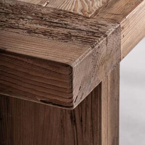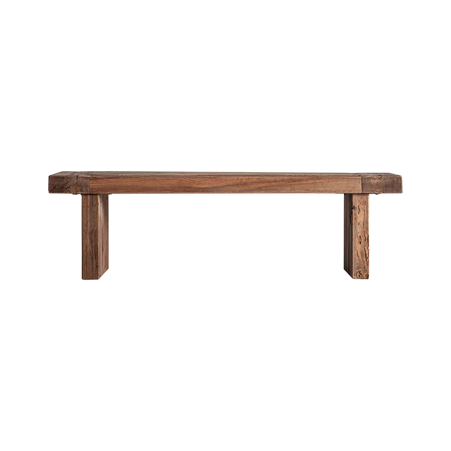 Banco breive de estilo rústico fabricado en madera de pino reciclado en color marrón con acabado envejecido.