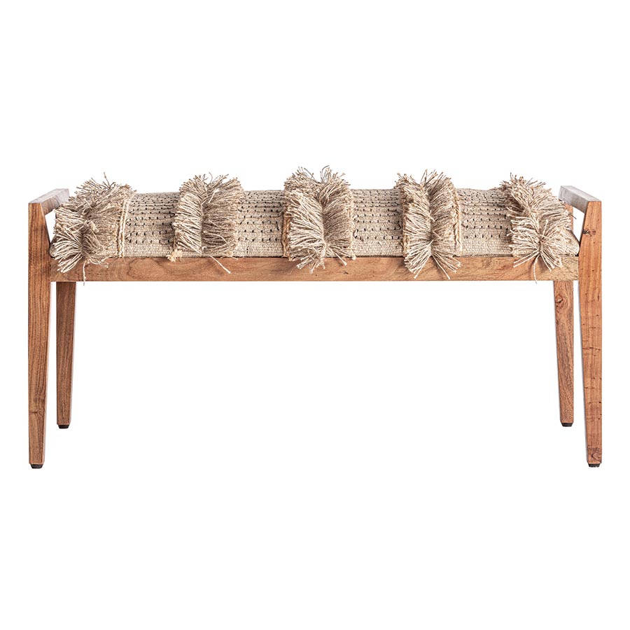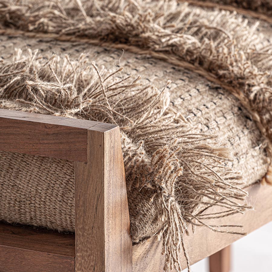 Banco Corao de estilo boho fabricado en madera de mango en color marrón claro combinado con algodón en color tonos en marrón y yute en color beige.