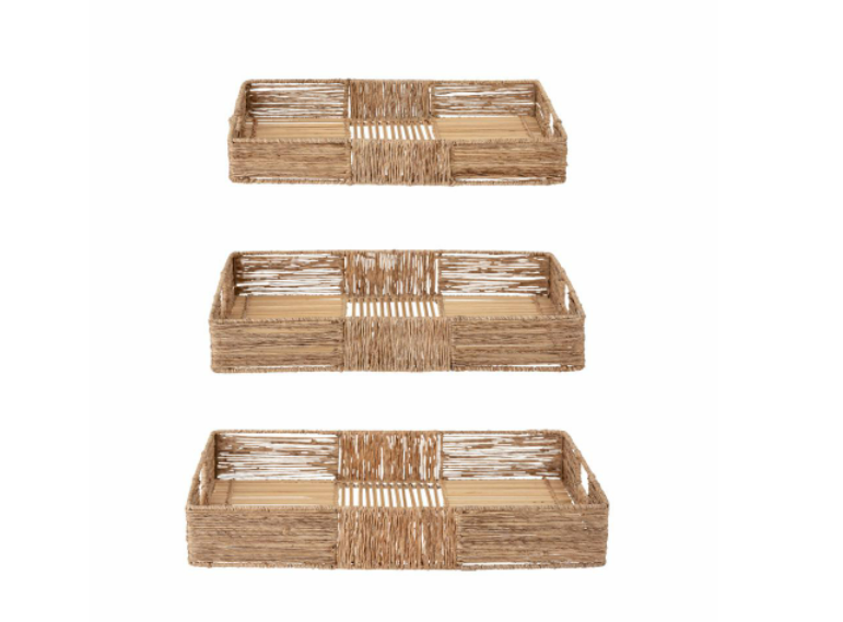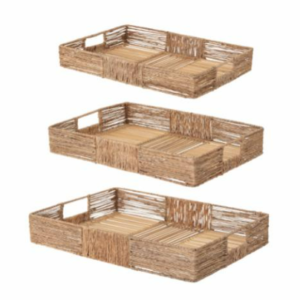 La bandeja Lecia  es un juego completo de 3 bandejas con una hermosa mezcla de yute, bambú y metal. Cada bandeja tiene un tamaño diferente, lo que te vendrá muy bien para guardar diferentes accesorios para tu cocina. Sus fibras naturales aportarán un toque muy fresco a la decoración de tu hogar.
