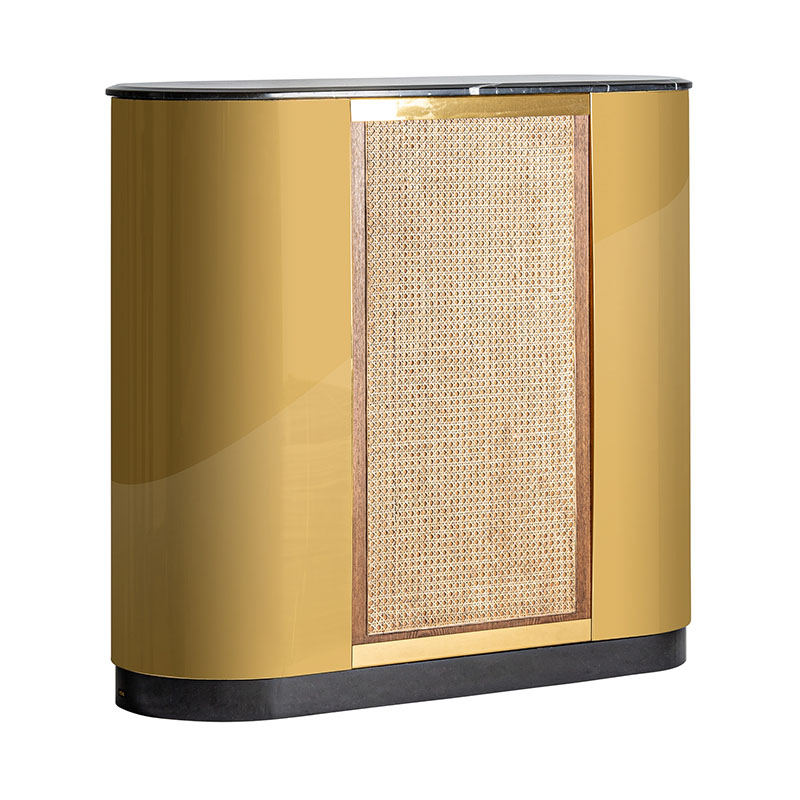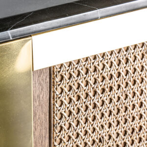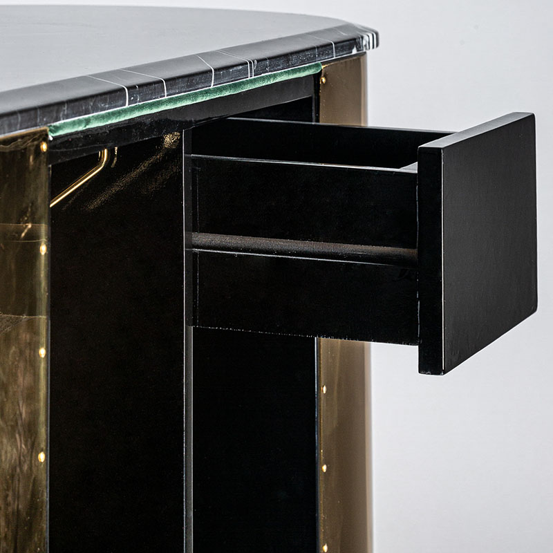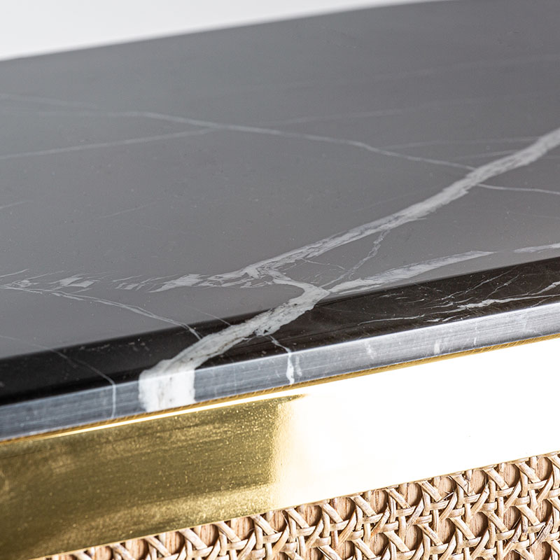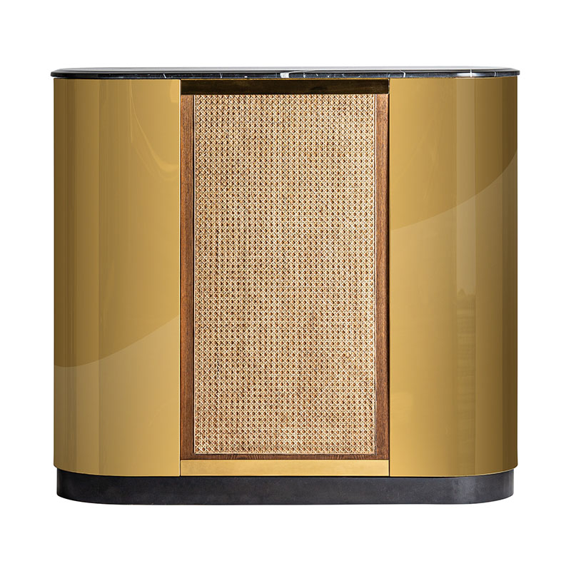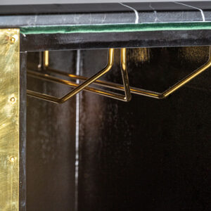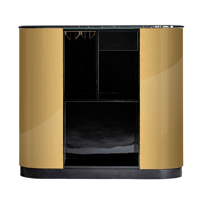 Mostrador Valbruna de estilo art deco fabricado en madera dm en color oro con acabado revestimiento de latón combinado con mármol en color negro con acabado texturizado y hierro en color negro con acabado revestimiento en polvo negro. Producto desmontable.