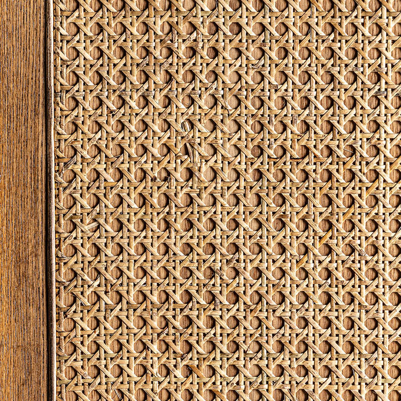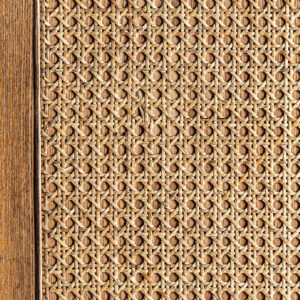 Mueble bar texas de estilo nórdico fabricado en madera de mango reciclada en color marrón combinado con forja en color negra y piel de vaca en color tonos en marrón.