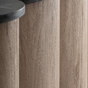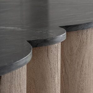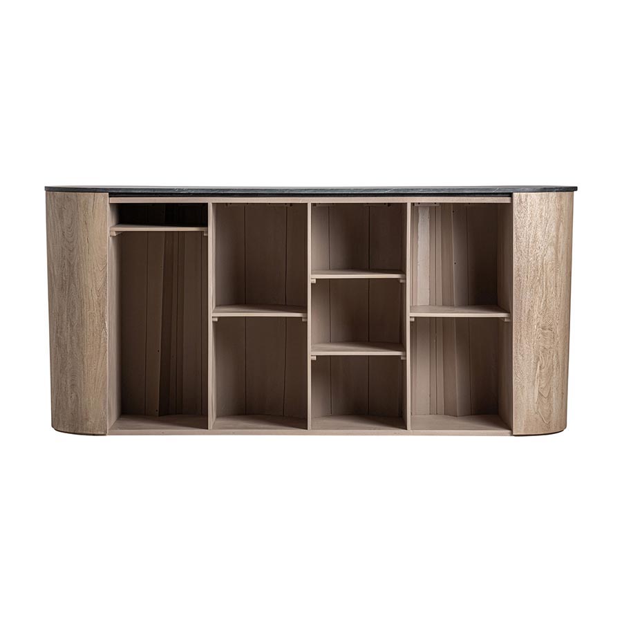 Barra de bar Kleit de estilo contemporáneo fabricado en madera de acacia en color marrón claro combinado con mármol mate en color negro.