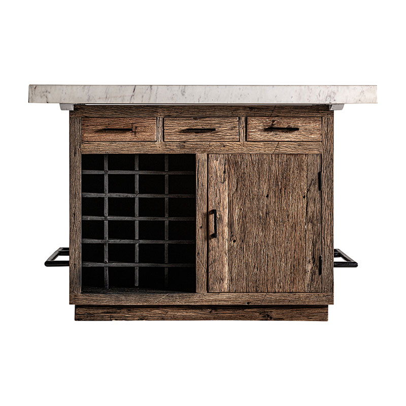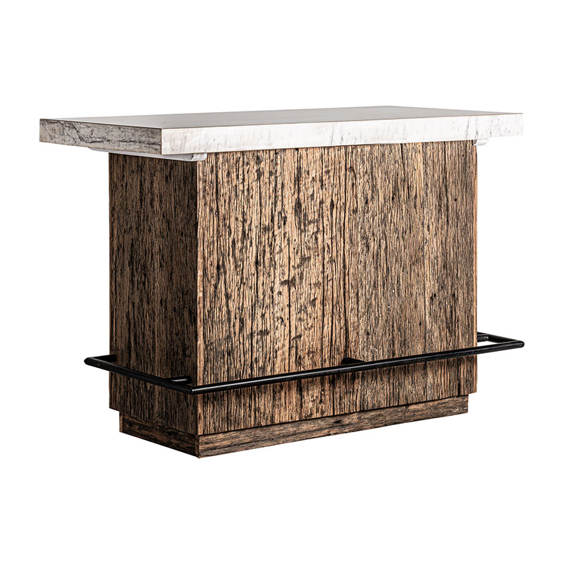 Barra de bar samsun, en color blanco/natural, de estilo colonial. Fabricado en madera recuperada, combinado con mármol. Producto desmontable.