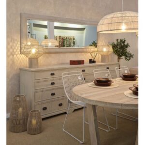 Buffet de madera acabado blanco grisáceo con 11 cajones y tiradores metálicos oscuros *NOTA: El color puede variar en función de la luz recibida. La tonalidad es un blanco grisáceo. En estancias con más luz natural se apreciará un tono más claro y en zonas con menos luz natural la tonalidad irá a más gris.