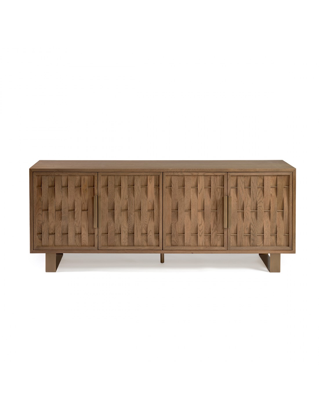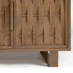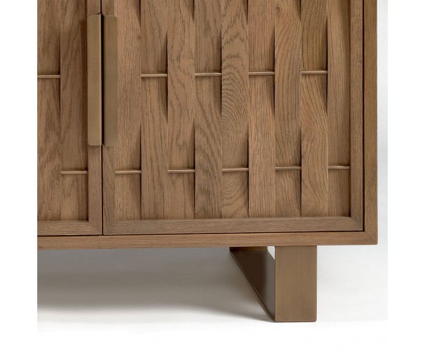 Aparador acabado en madera de roble con cuatro puertas. Aparador fabricado con pata de meal en color dorado envejecido. Una pieza original gracias a sus puertas con relieves que forman la misma madera en tono natural.