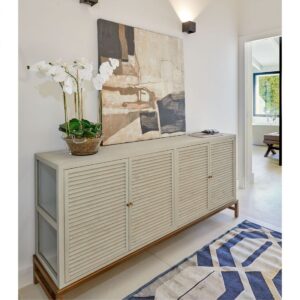 Aparador de madera y cristal. Es un mueble de comedor o salón con mucho estilo y original gracias a su color. Cuenta con dos módulos de almacenaje con dos puertas con frontal de persianilla (cerrada) cada uno. En el interior hay una balda que divide el almacenaje en dos niveles. Aparador de roble blanco grisáceo y patas de metal en color dorado envejecido. Los laterales de cristal dejan ver el interior del mueble.