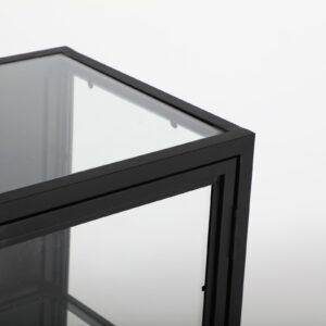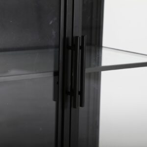 Buffet kilrea, en color negro, de estilo industrial. Fabricado en hierro, combinado con madera de abeto y vidrio.