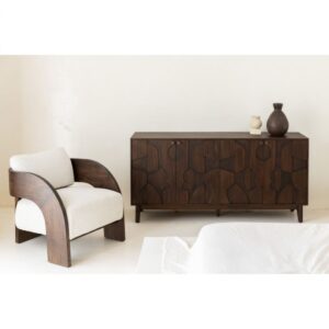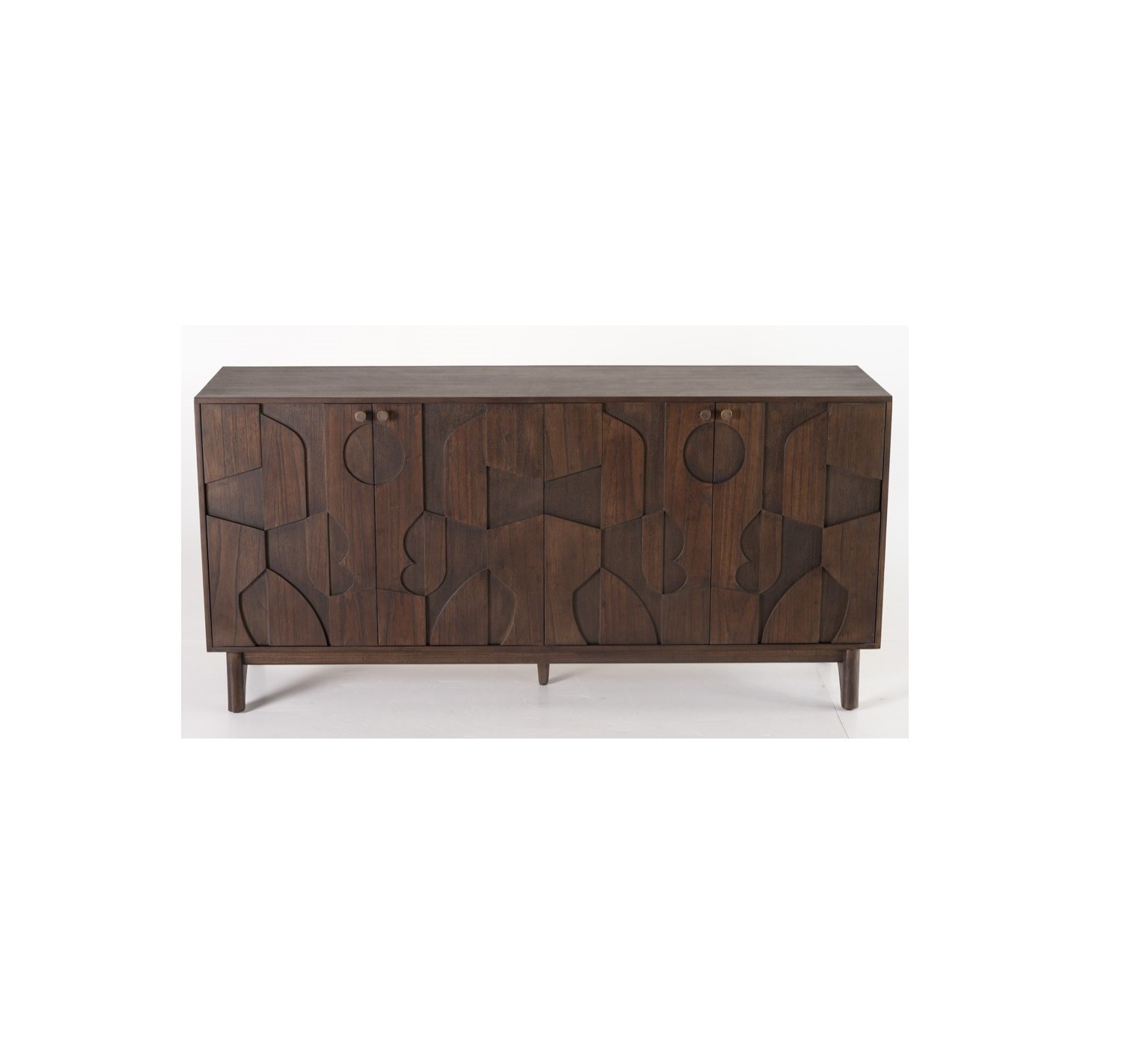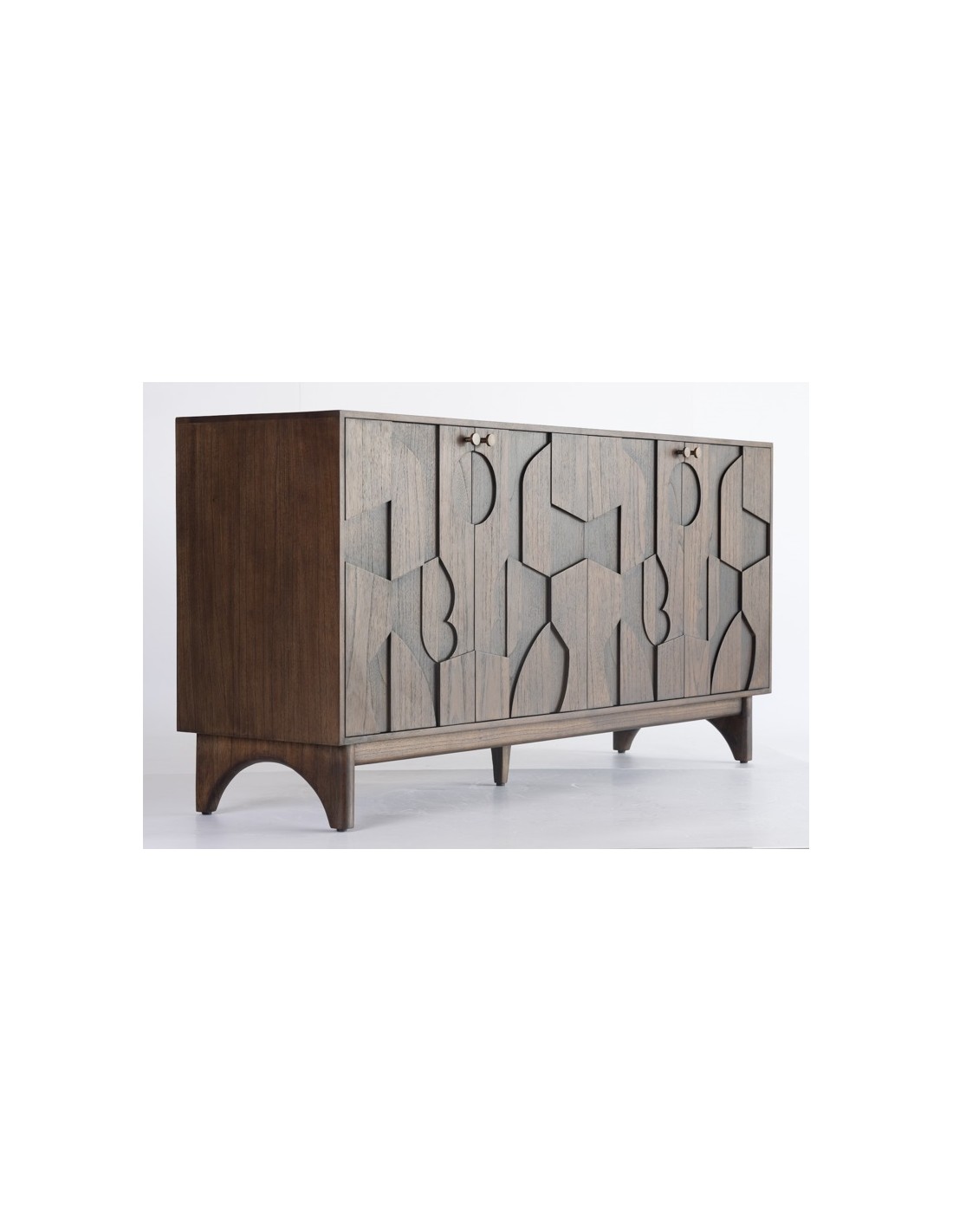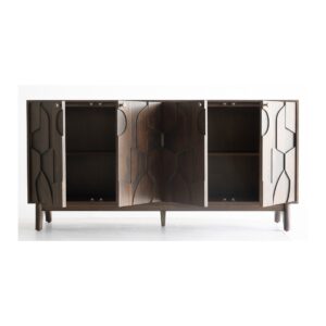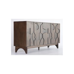 Buffet de madera color café con 4 puertas. Los frontales cuenta con relieves en formas geométricas que dan originalidad a la pieza. El interior está divido por una balda central que divide la altura del aparador en dos. La estructura del aparador está soportada por una original pata de de la misma madera con líneas curvas.