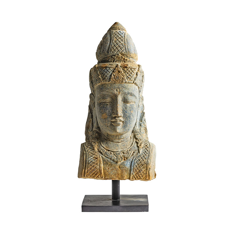 Busto budha, en color marrón, de estilo oriental. Fabricado en piedra.