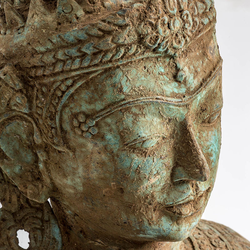 Busto de estilo oriental fabricado en latón en color tonos en verde con acabado envejecido. Producto desmontable.