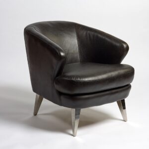 Preciosa Butaca de cuero envejecido de color oscura.  Esta butaca aportará un toque Loft a tu salón gracias a su color negro. Sillón con aspecto sobrio y refinado. Es una butaca sencilla pero a la vez tiene un toque distintivo gracias a sus patas de acero de  color plata. Combina perfectamente en cualquier lugar de tu hogar pero especialmente en aquellos rincones que son ideales para la lectura.