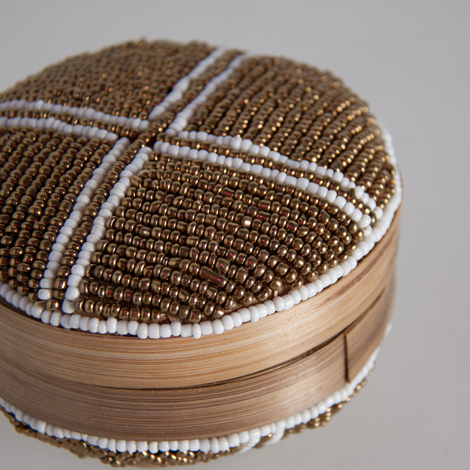 CAJA REDONDA, EN COLOR MARRÓN, DE ESTILO ÉTNICO. FABRICADO EN BAMBÚ.