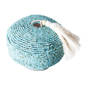 CAJA REDONDA, EN COLOR TURQUESA, DE ESTILO ORIENTAL. FABRICADO EN BAMBÚ.