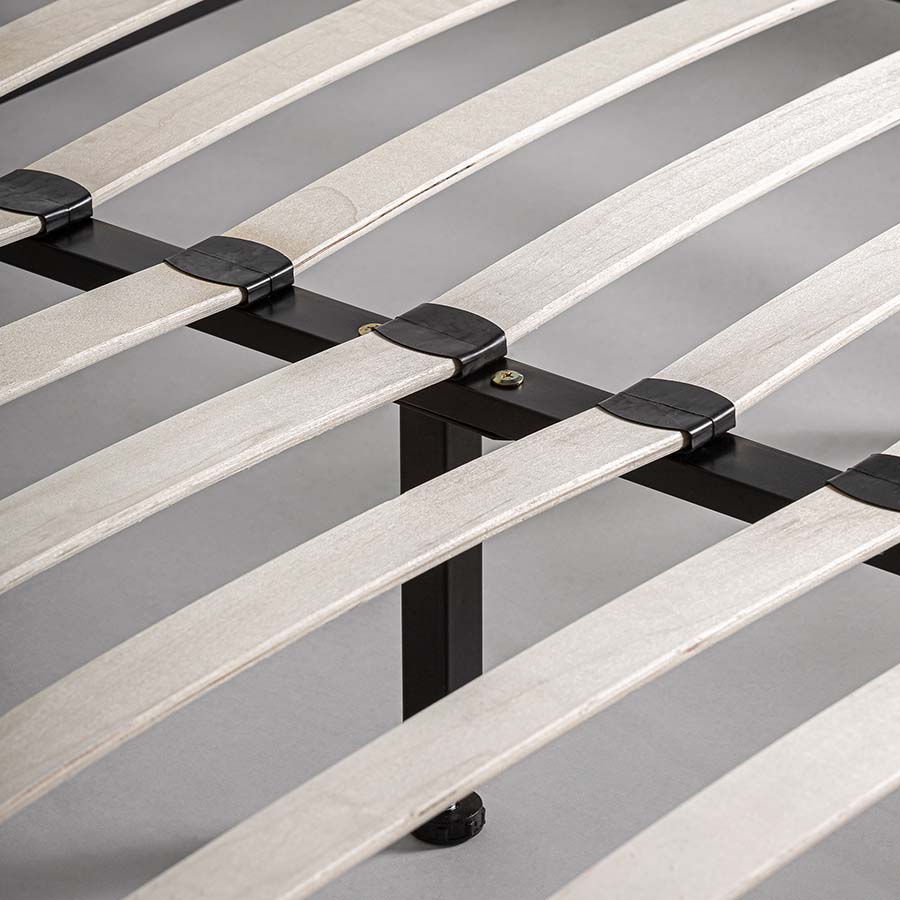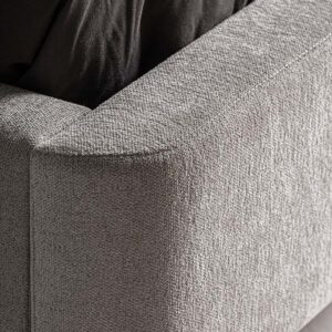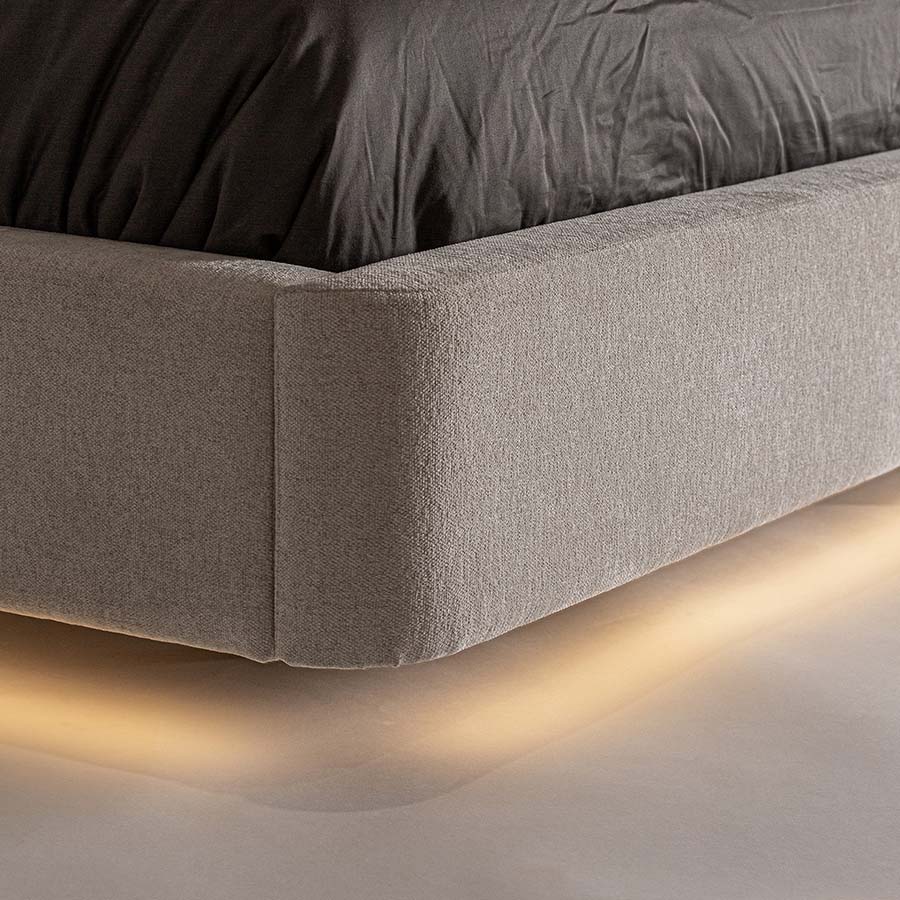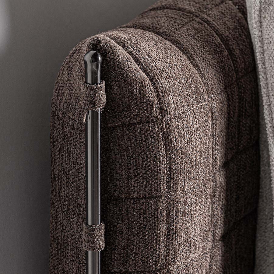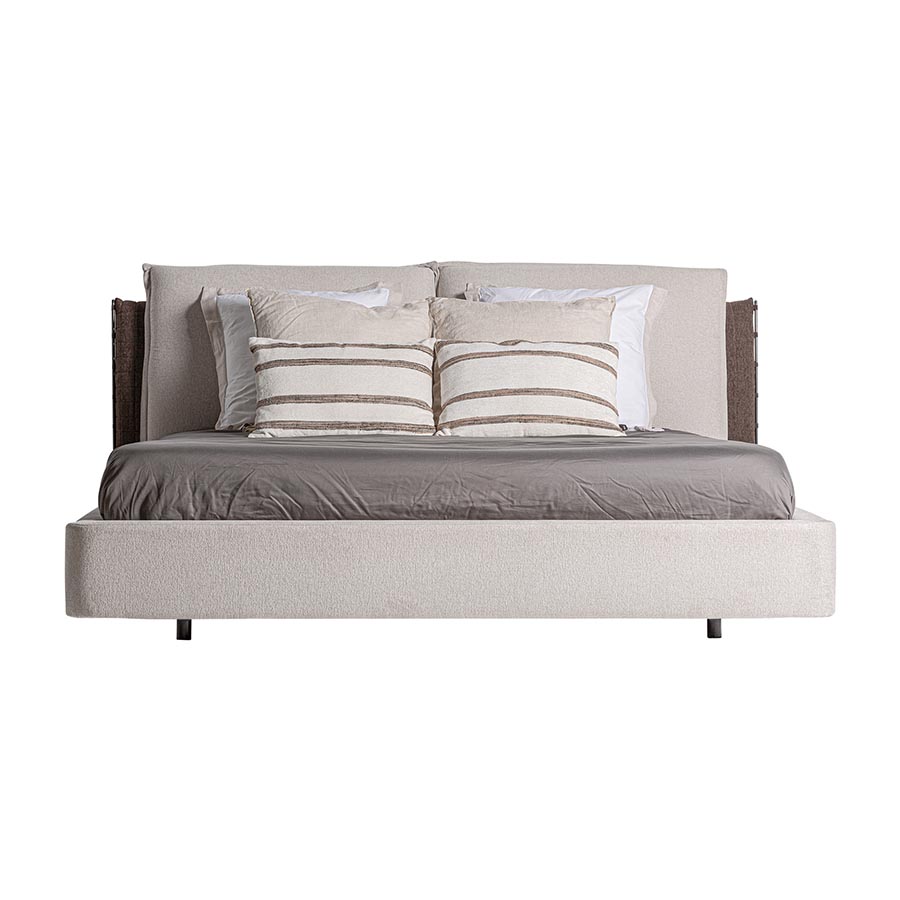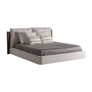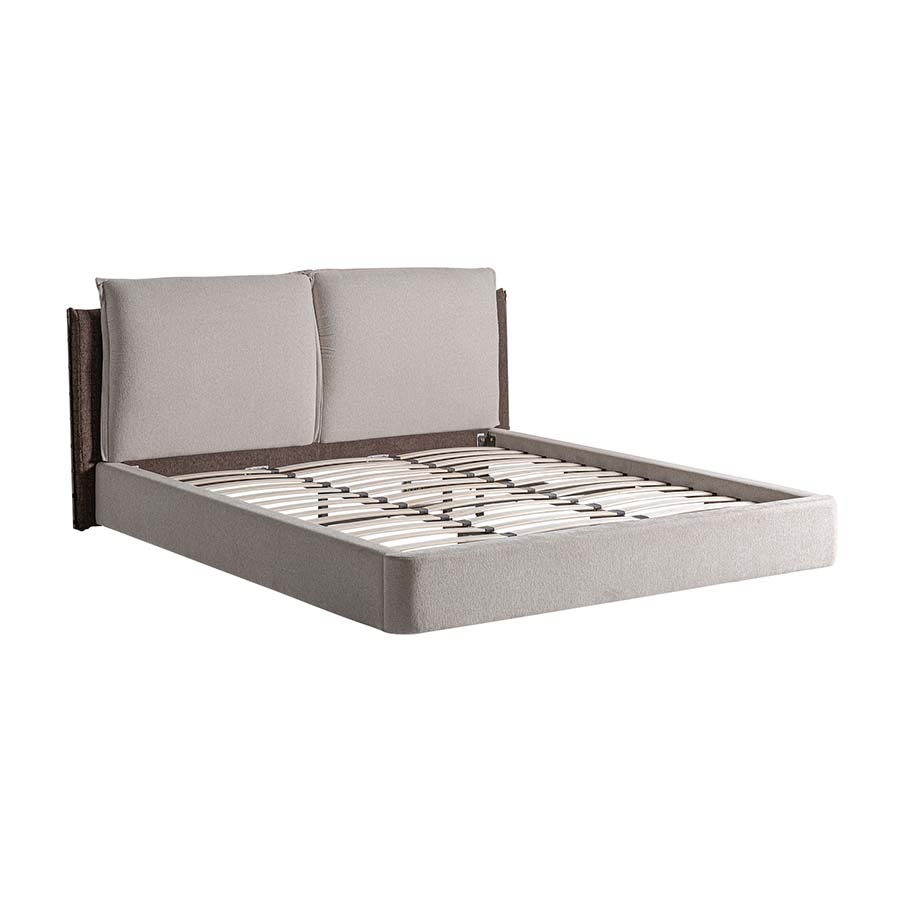 Cama Kioto de estilo contemporáneo fabricado en tela en color beige combinado con tela en color marrón con acabado oscuro y madera de pino en color marrón.