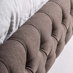 Cama Oslo de estilo provenzal fabricado en tela en color marrón combinado con madera de pino en color marrón y madera mahogani.