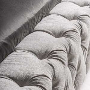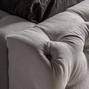 Cama Santorini de estilo provenzal fabricado en tela en color beige combinado con madera de pino y espuma.