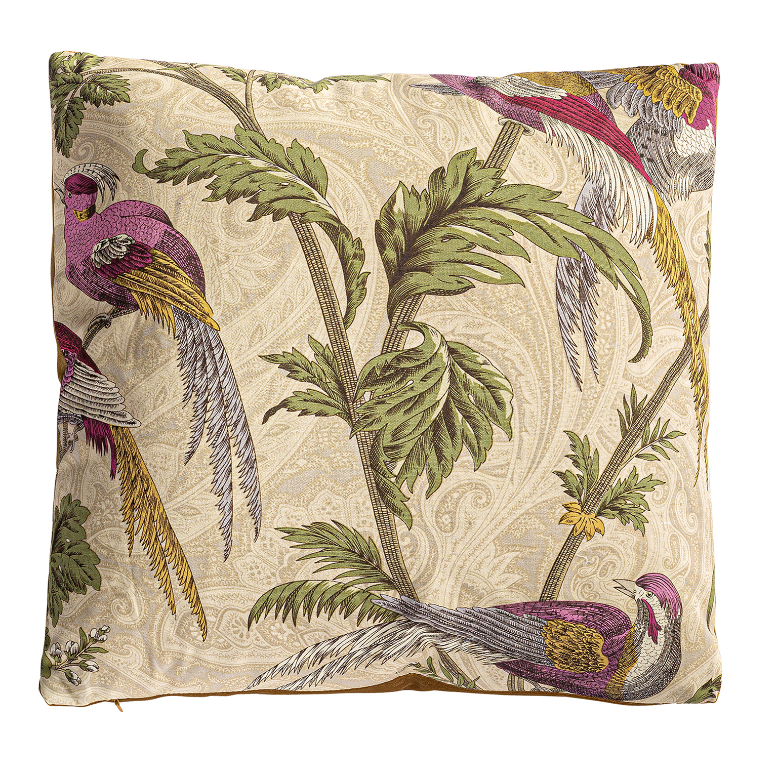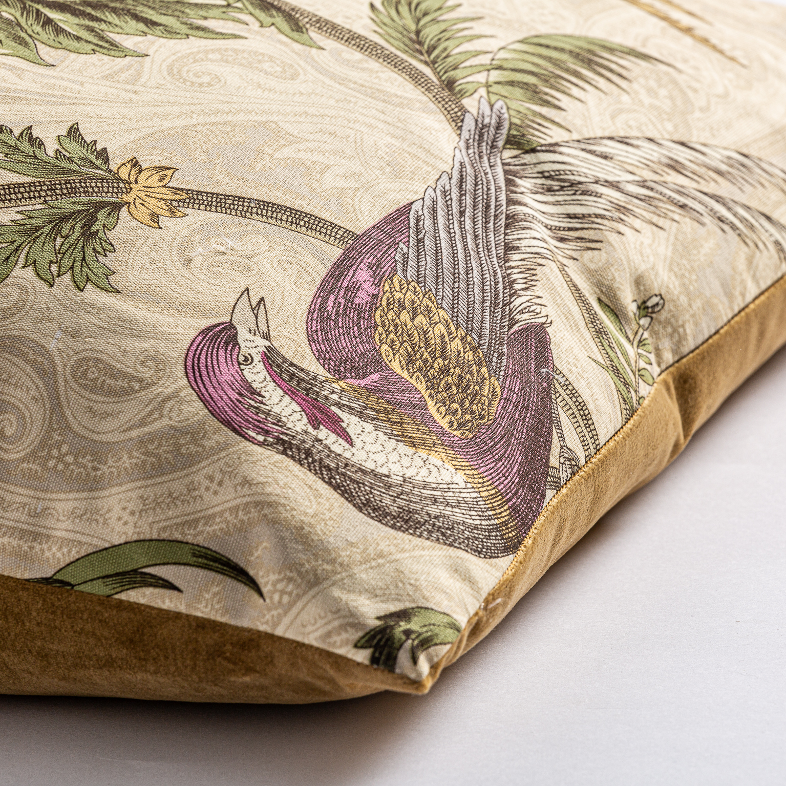COJÍN CUADRADO CANDAN, EN COLOR TONOS CLAROS, DE ESTILO SHABBY CHIC. FABRICADO EN TERCIOPELO, COMBINADO CON PLUMAS.