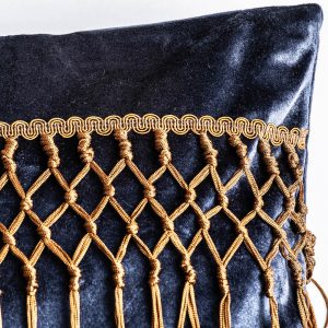 COJÍN DESA, EN COLOR AZUL/ORO, DE ESTILO KITSH. FABRICADO EN TERCIOPELO, COMBINADO CON POLIÉSTER Y PLUMAS.
