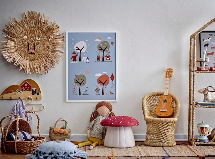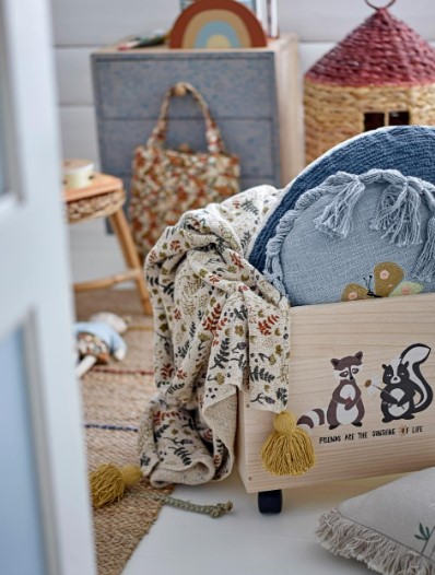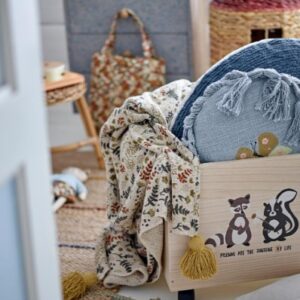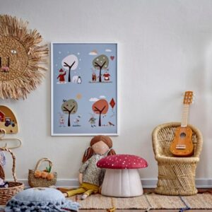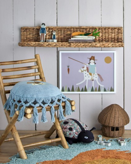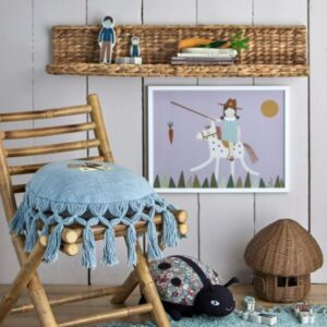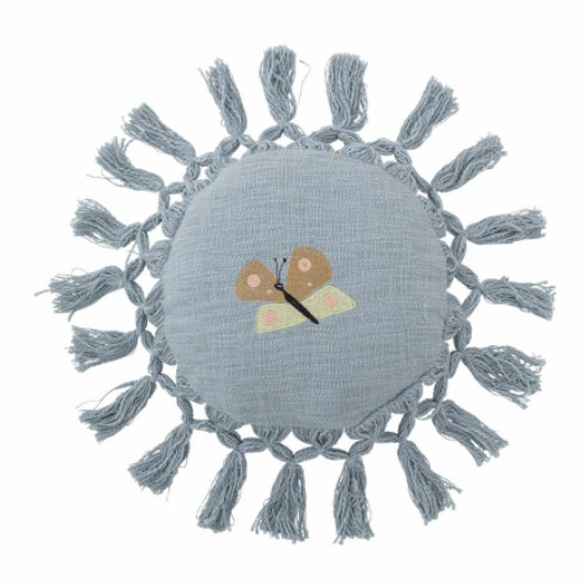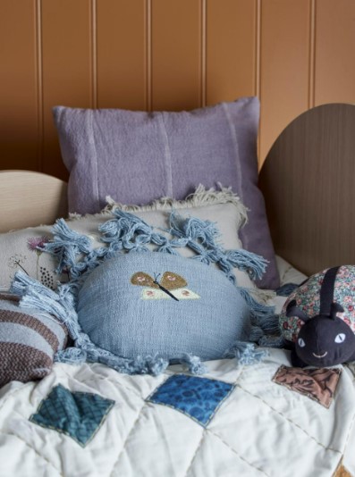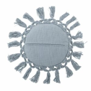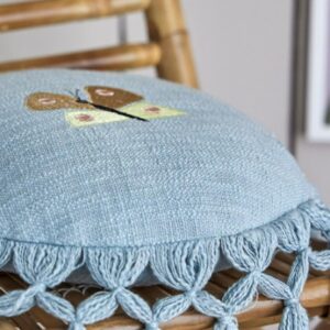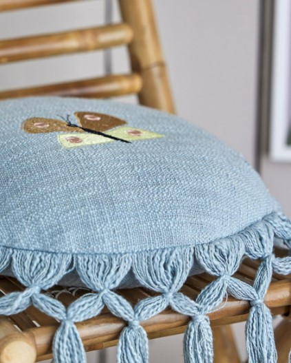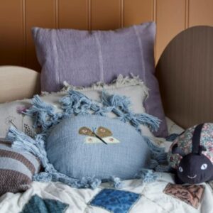 El cojín Elinna de Bloomingville MINI tiene una forma redonda con grandes borlas alrededor del borde. Está hecho en un bonito color azul con una mariposa en el medio. El cojín está hecho de algodón reciclado y encaja muy bien en la habitación de los niños o en un invernadero.