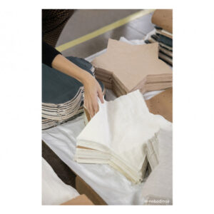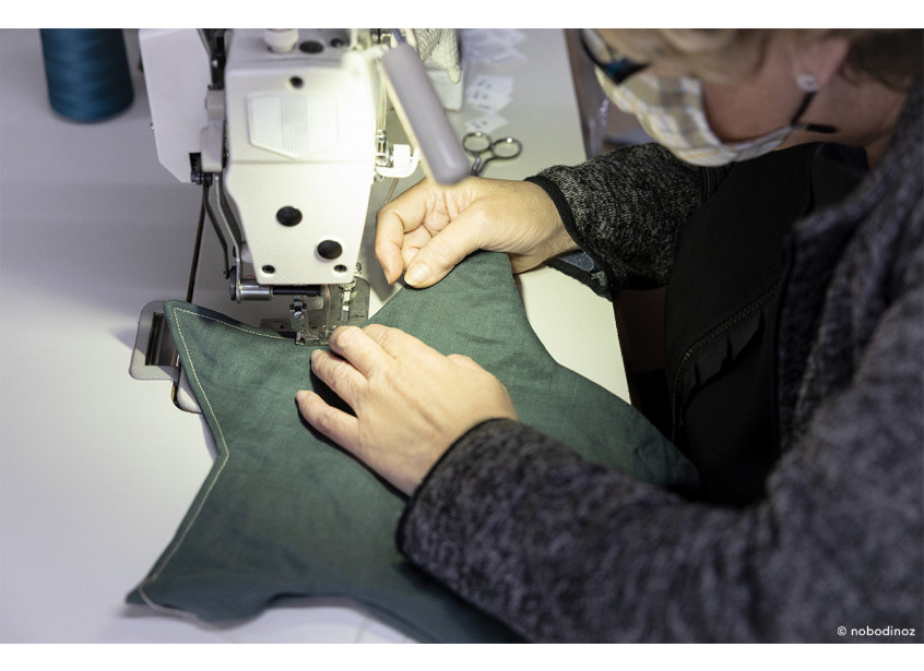 El lino se cultiva en Francia, el tejido y el acabado se realizan en Barcelona, y la confección se lleva a cabo en los talleres de Nobodinoz en Barcelona.  Esta producción en circuito corto garantiza la mejor calidad y reduce la huella de carbono al mínimo: el lino francés de Nobodinoz no viaja en avión ni en barco.