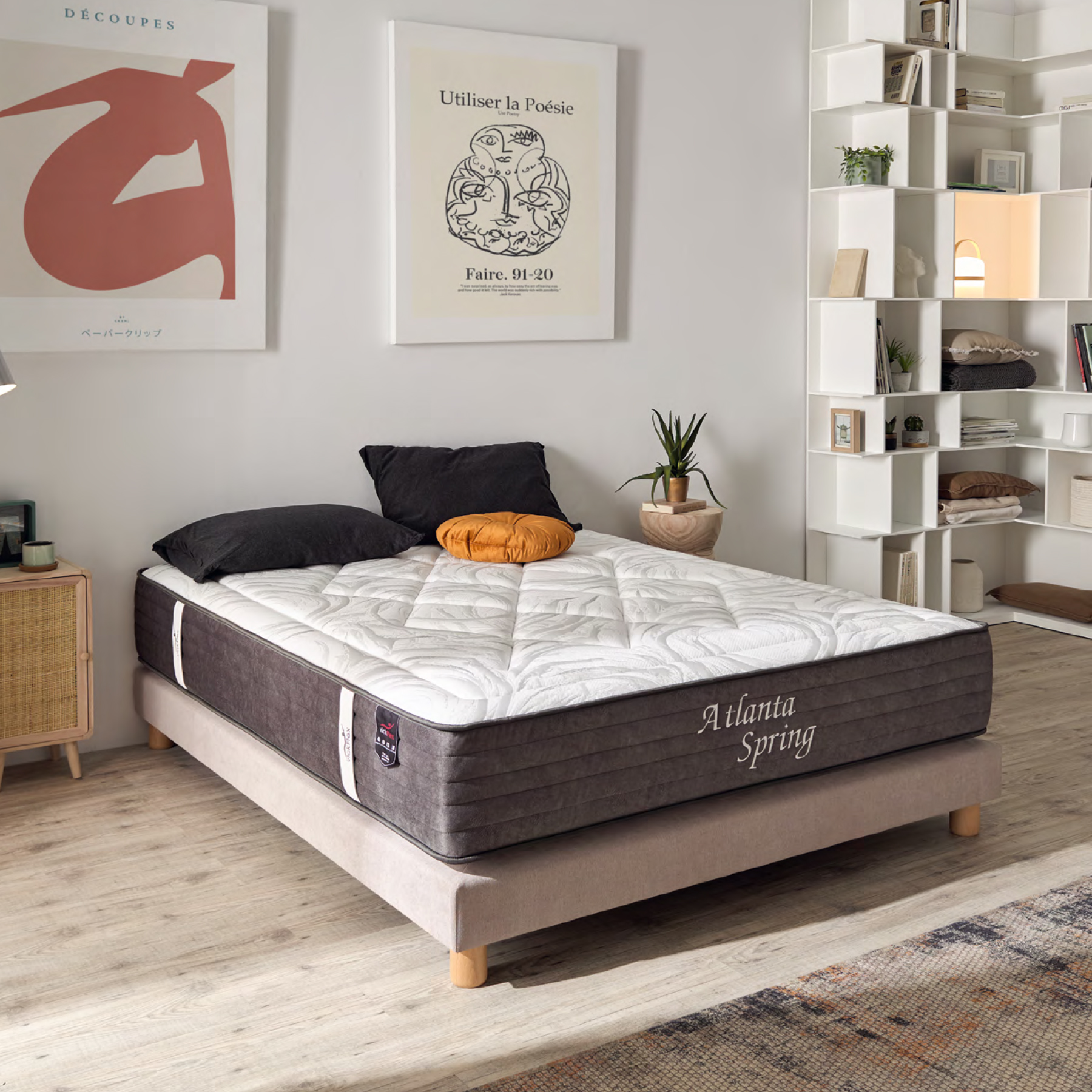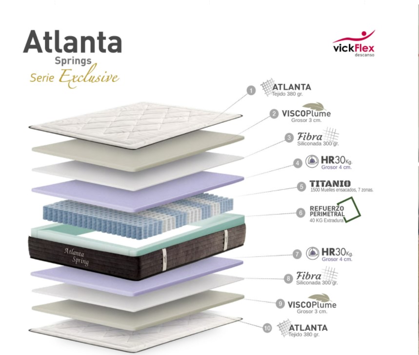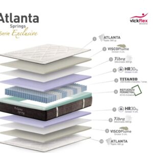 El modelo Atlanta Spring está compuesto por fibras siliconadas de 300gr. La carcasa, de muelles ensacados, está compuesta  por 1500 muelles de titanio. Dispone de siete zonas lumbares para un mayor confort. La carcasa además, viene siempre acompañado de 8 cm de refuerzo perimetral, con lo que al sentarse sobre el colchón, se consigue una mayor adaptabilidad.